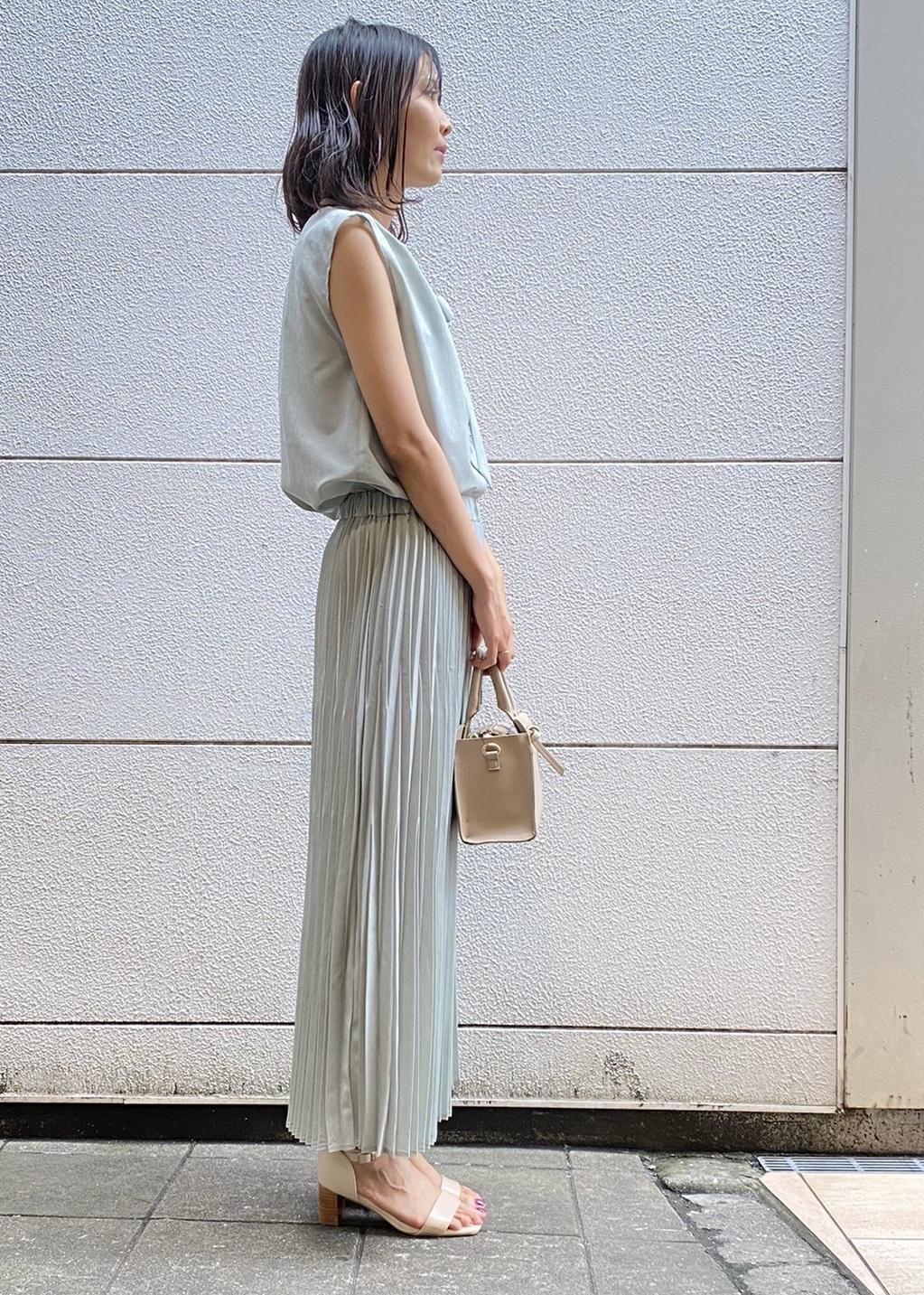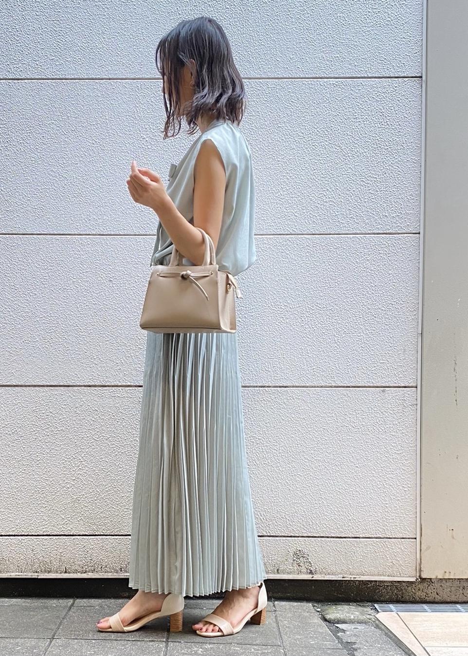 大人な印象で、淡いカラーで爽やかイメージを持たせてくれるコーディネートです。オンオフ両使いができ、シンプルながらもキレイ感があり、スカートスタイルで女性らしさをさらに上げてくれます。