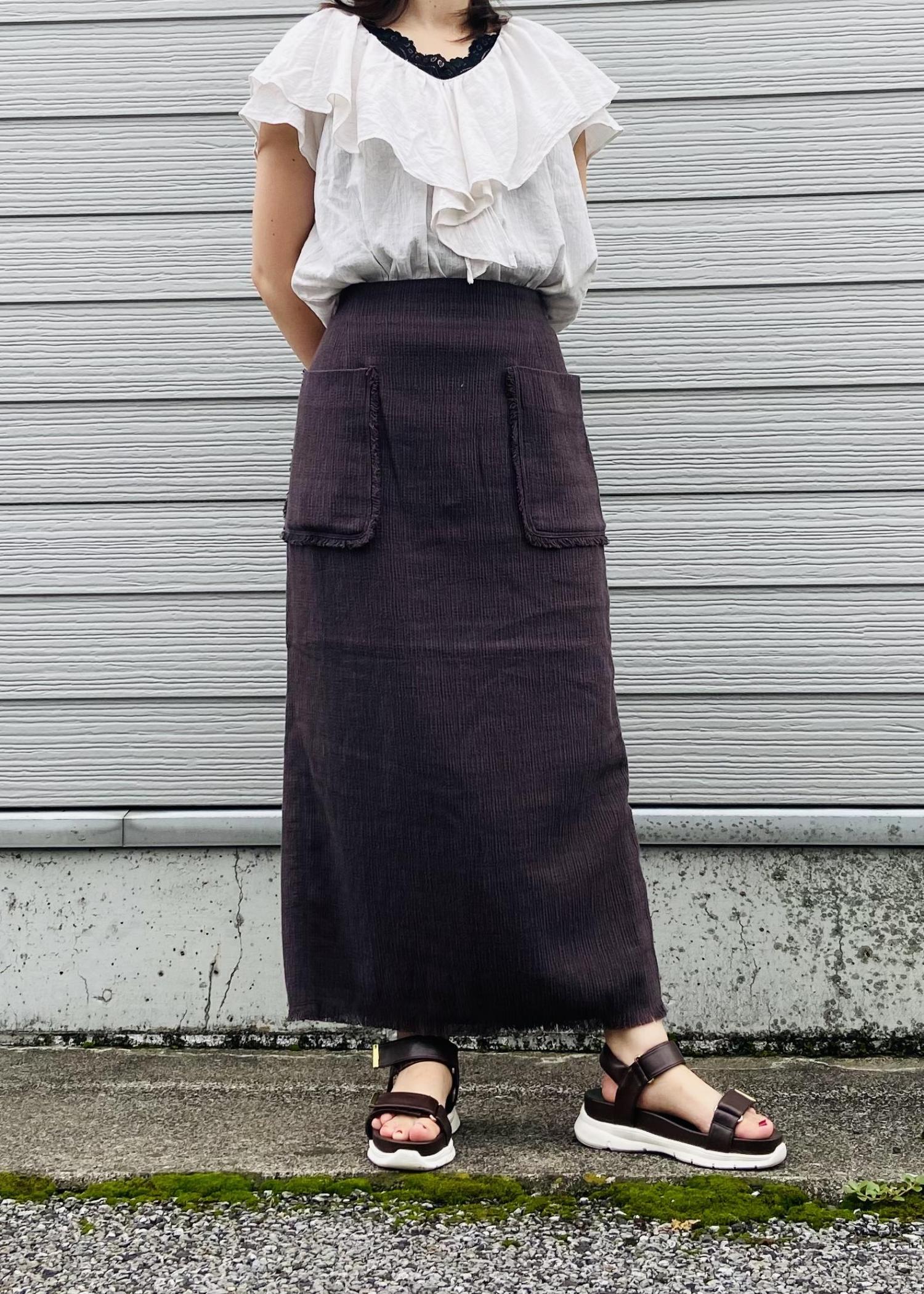 上下をコットン100%の似たような素材感で合わせて、柔らかくふんわりしたコーデにしました。コットン生地の柔通気性や吸水性が高く、暑い夏には大活躍です!