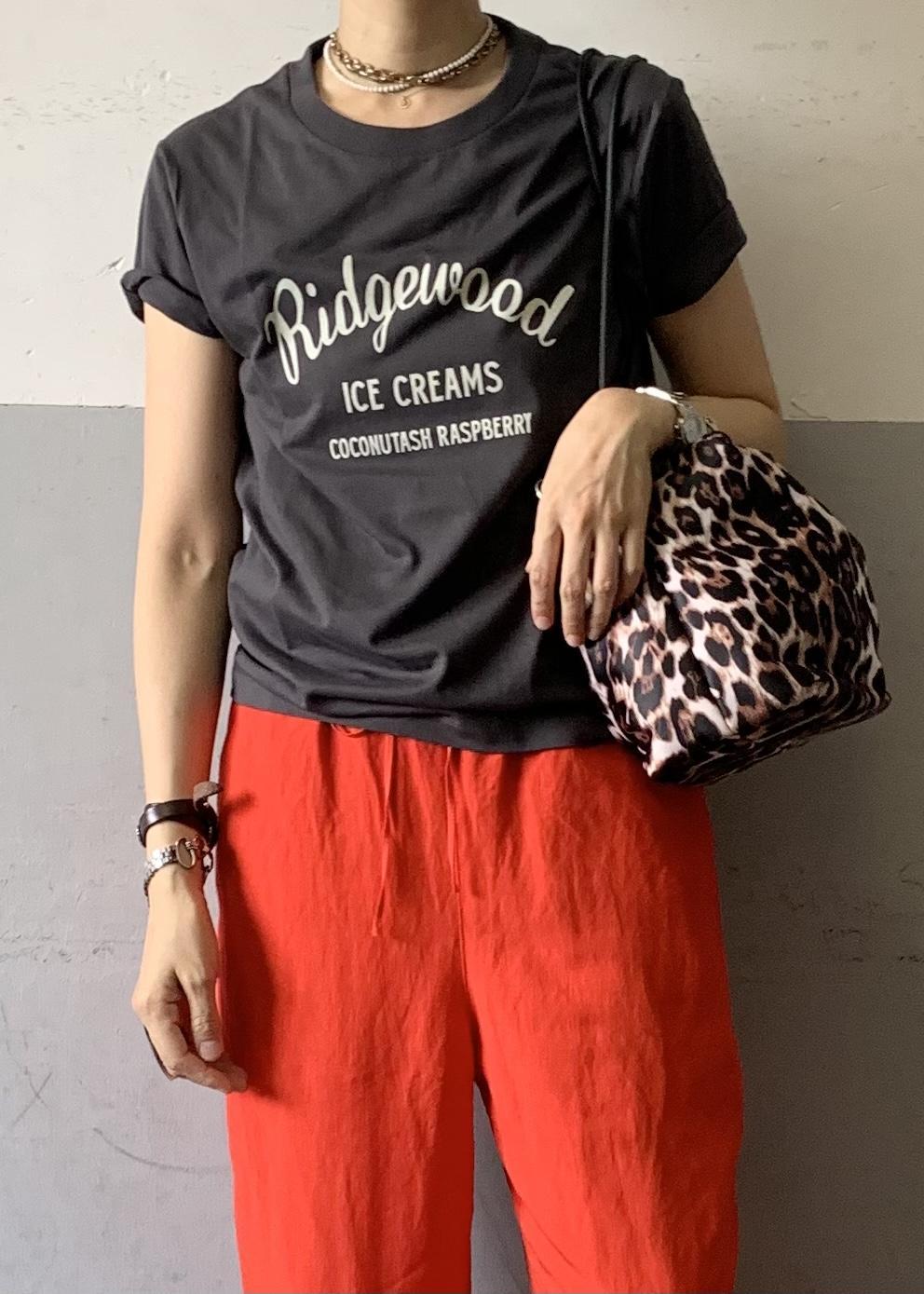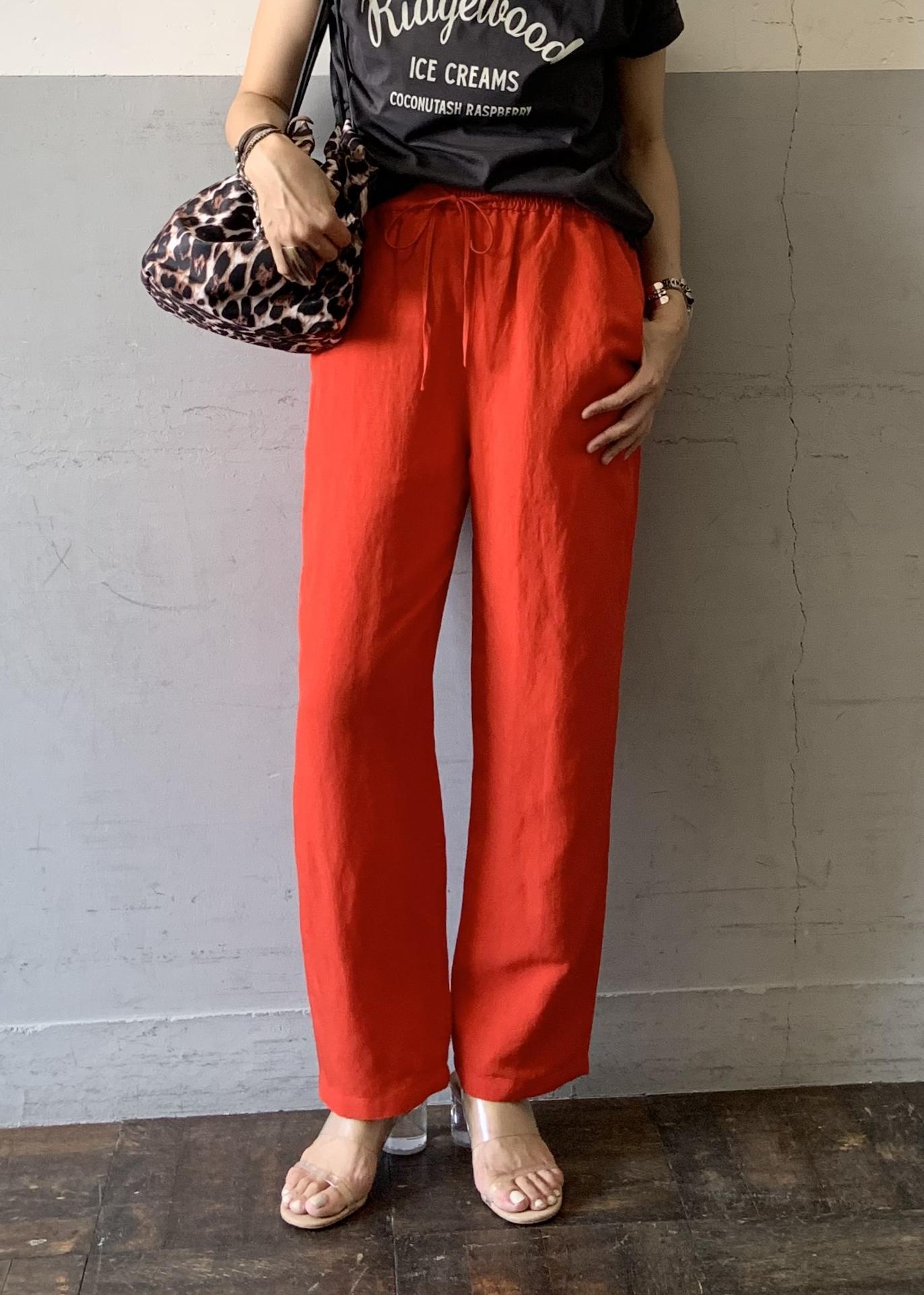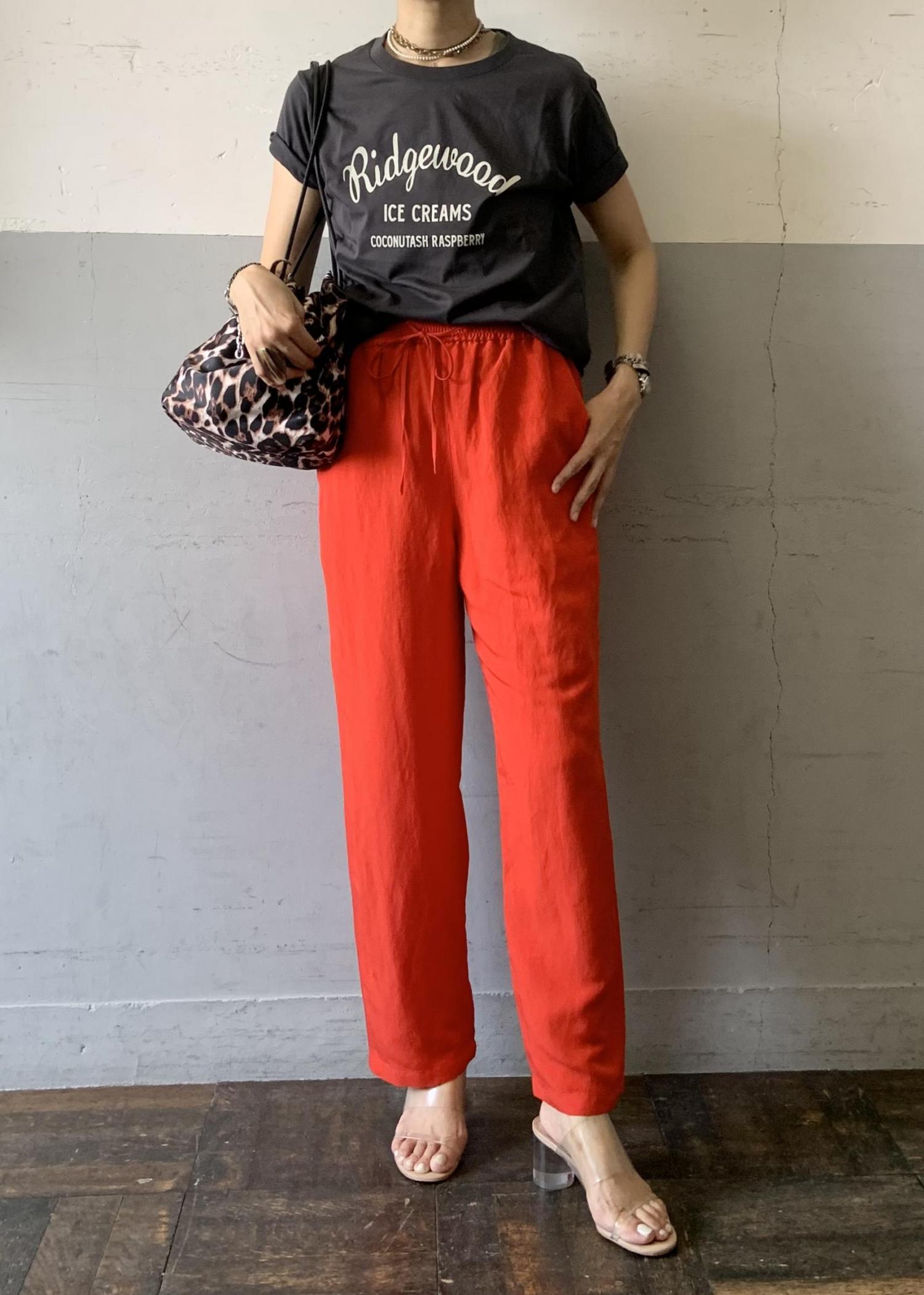 とヴィヴィットな赤のイージーパンツを合わせてみました。