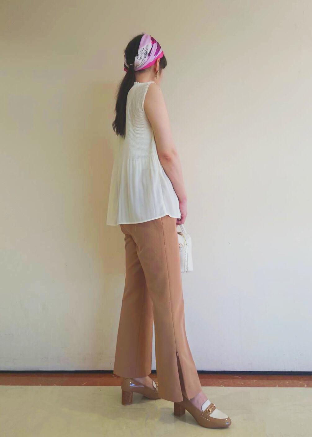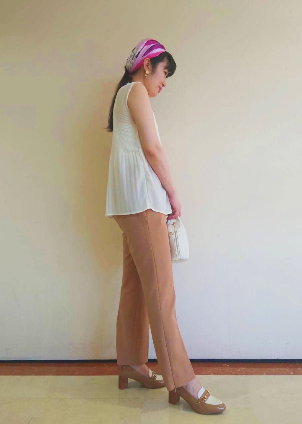 私はお尻周りが気になるのでチュニック丈のブラウスと合わせました。トップスの丈が長めでの時はノースリーブや鎖骨が見える物など、女性らしいパーツを出せるデザインを選ぶとスッキリ見えやすいです(^.^)
