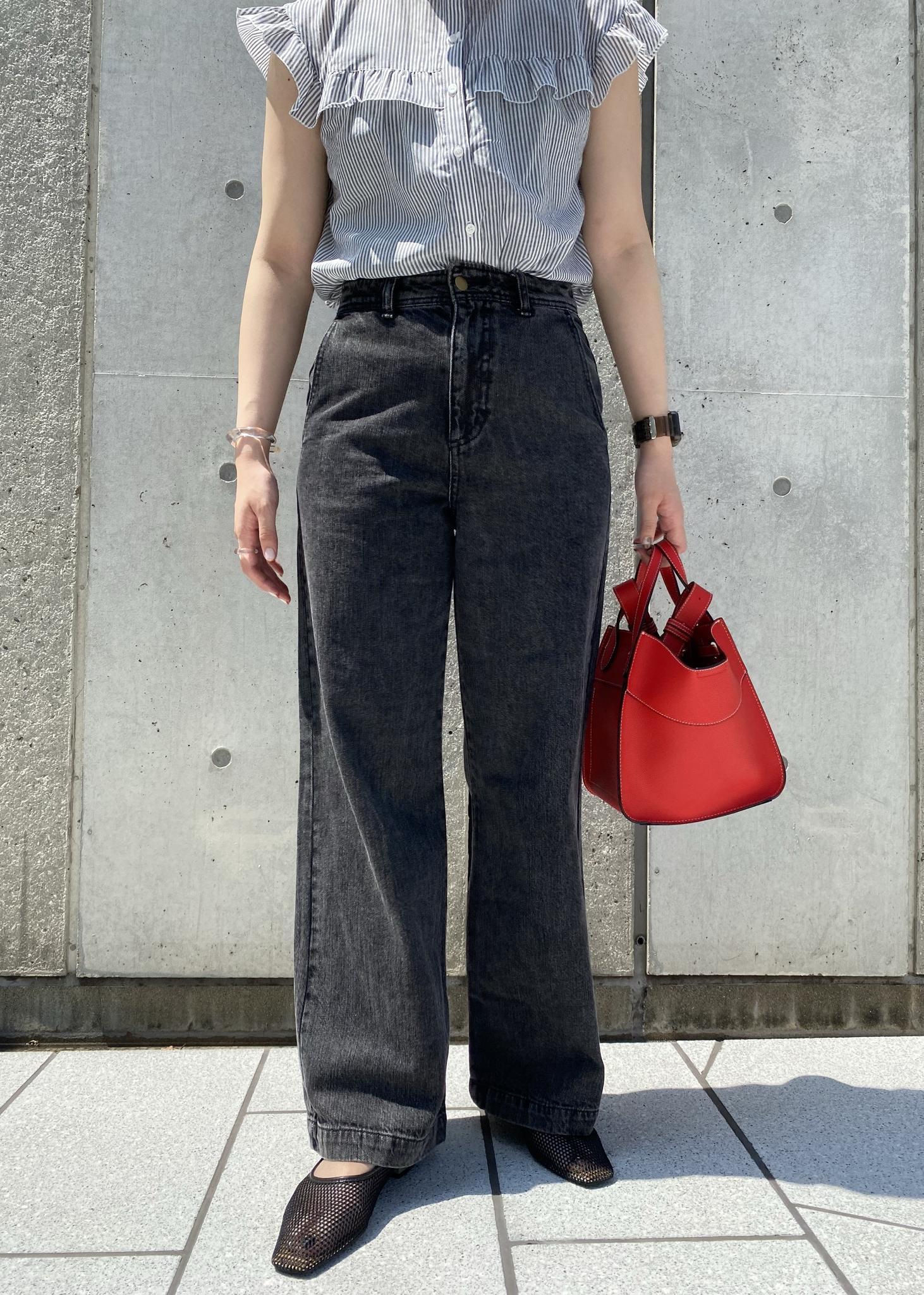 デニム=カジュアルのイメージですがフリルブラウスや小物使いで女性らしく着用して頂けます◎