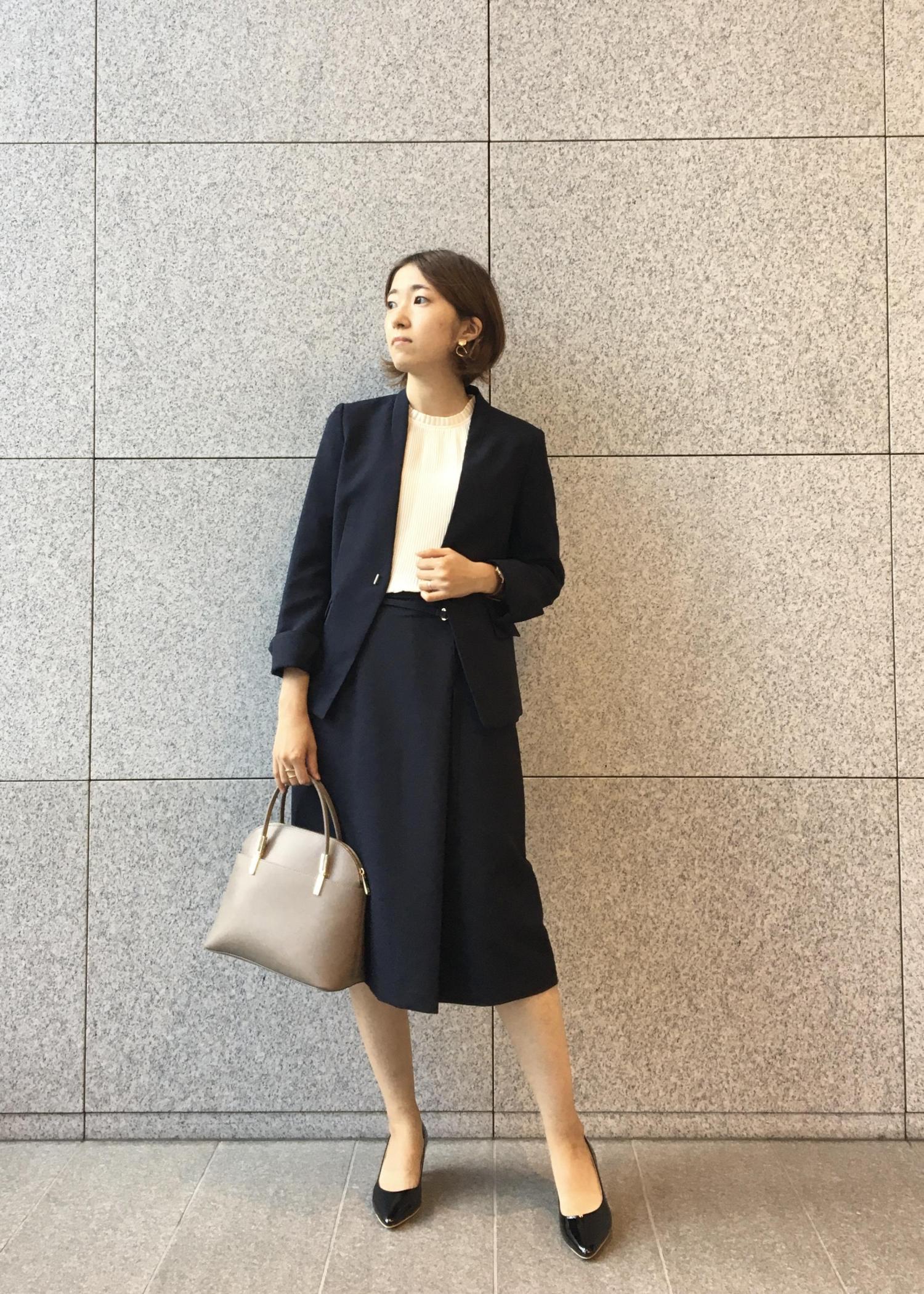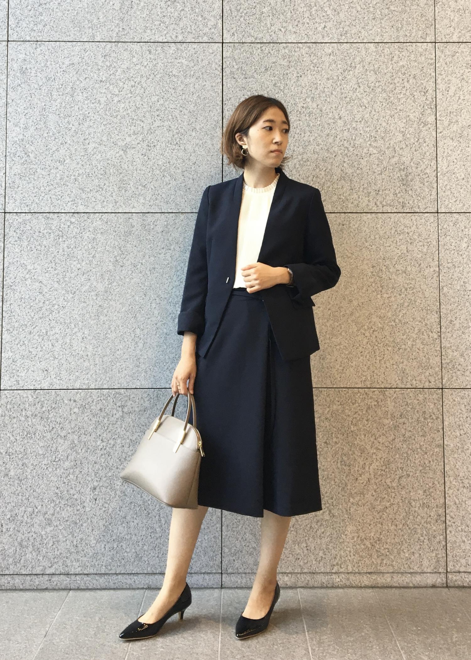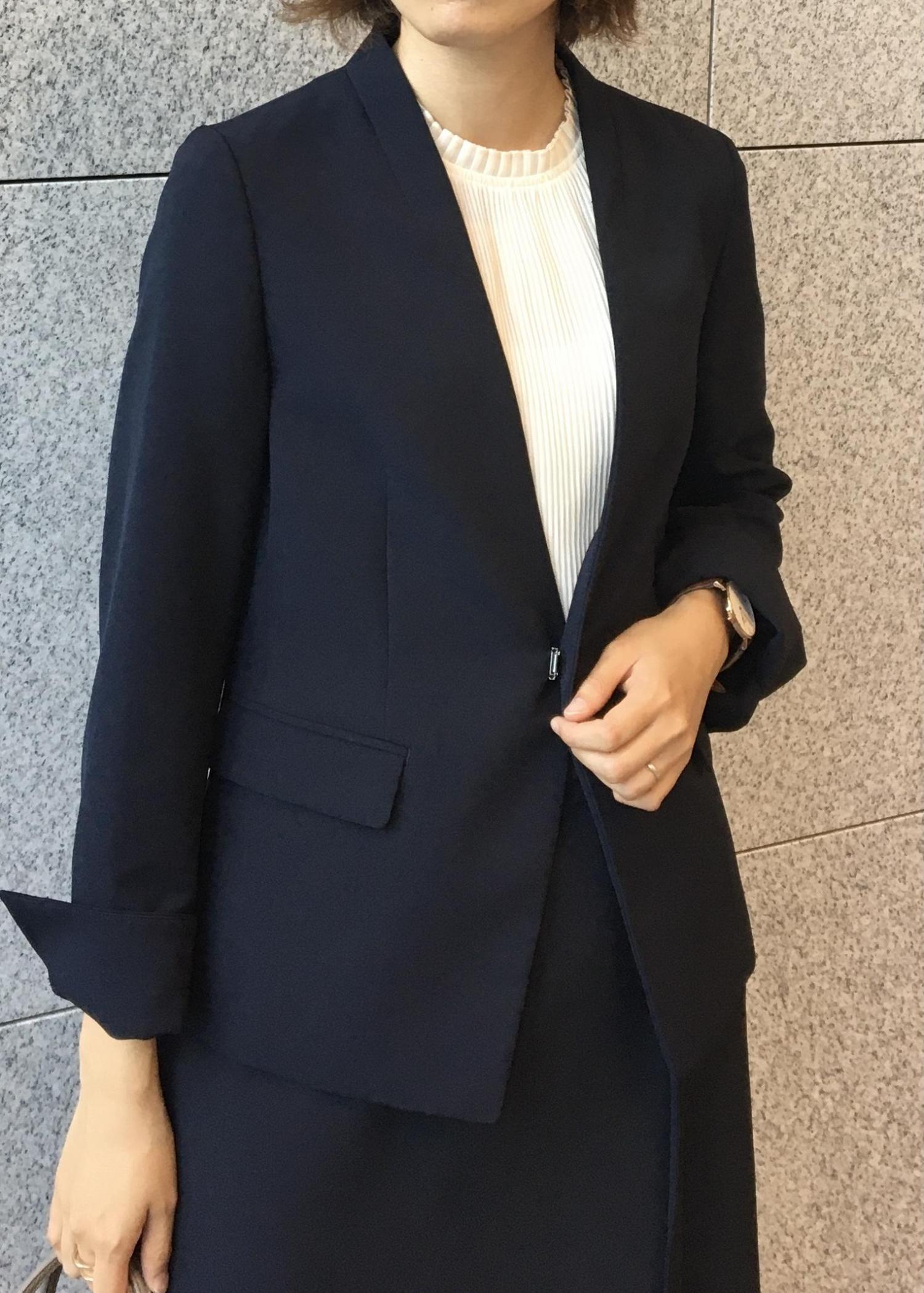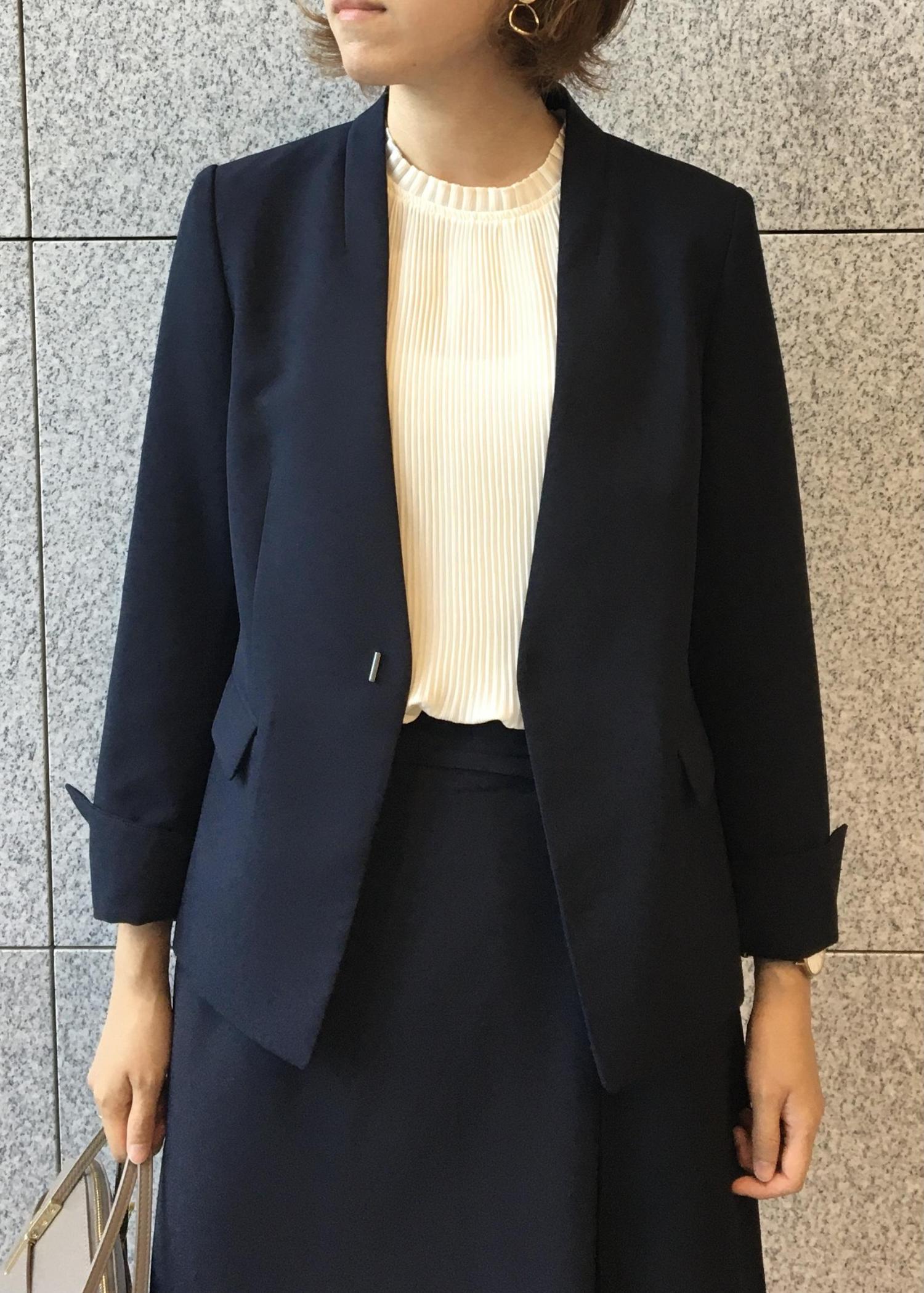 ジャケットはノーラペルでシンプルな作りなので、フリルインナーやリブトップスで合わせてもメリハリが出ます。