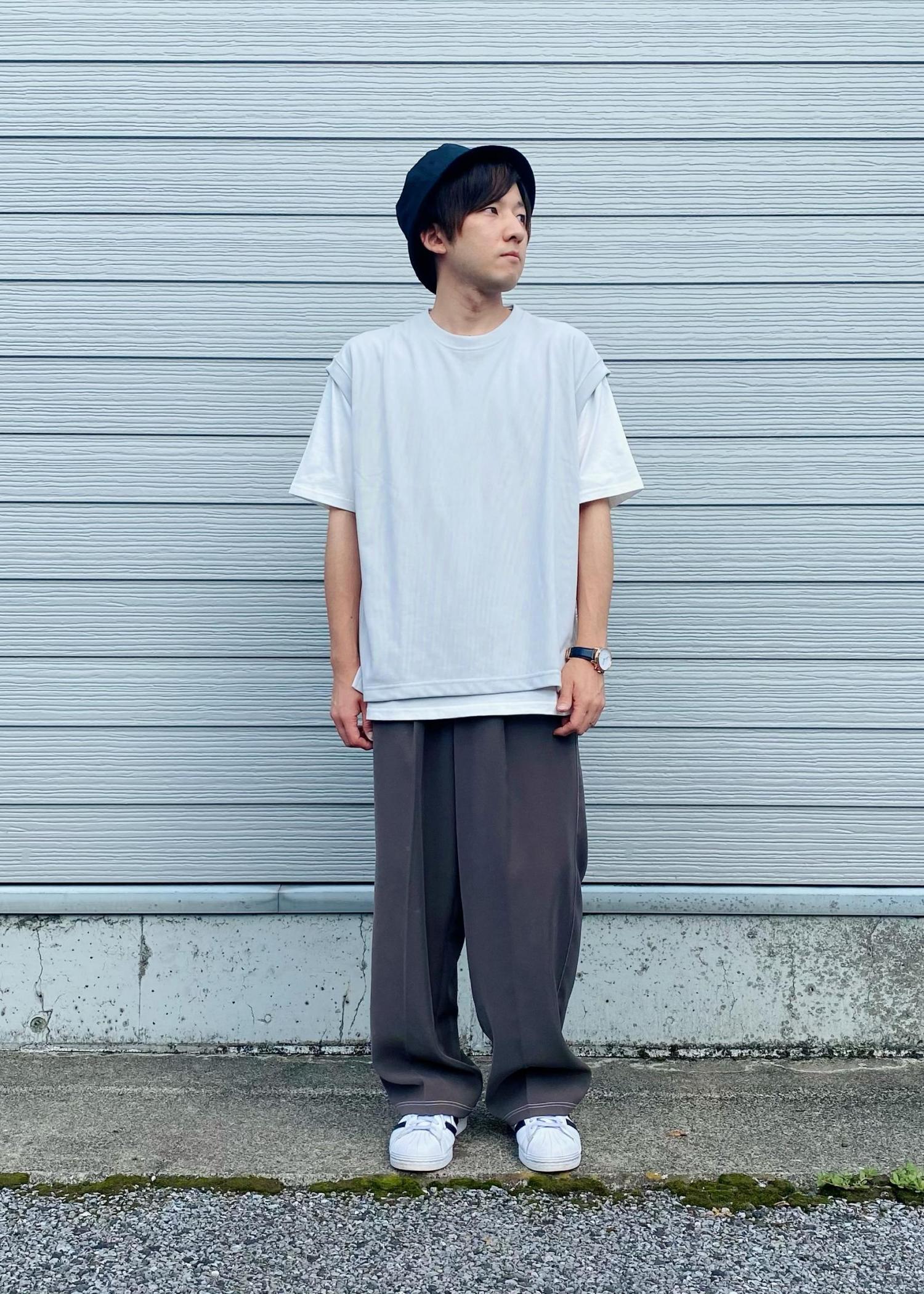 ベストとTシャツがセットになっているトップスにワイドパンツを合わせました。