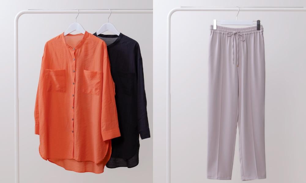 (左から) バンドカラーポケットシアーシャツ / ステファニージョガーパンツ