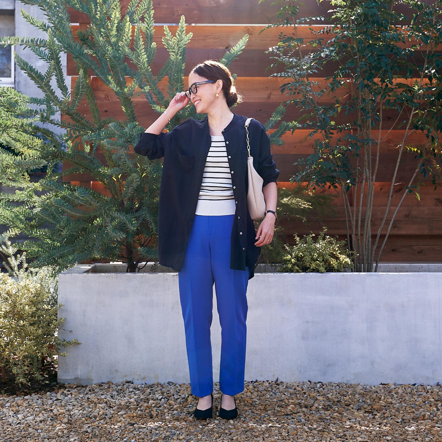 昨年色違いで購入した黒のシャツを今の気分で着まわし。職場でカラーに抵抗がある人は、ぜひボトムスからカラーものを取り入れてみてください。