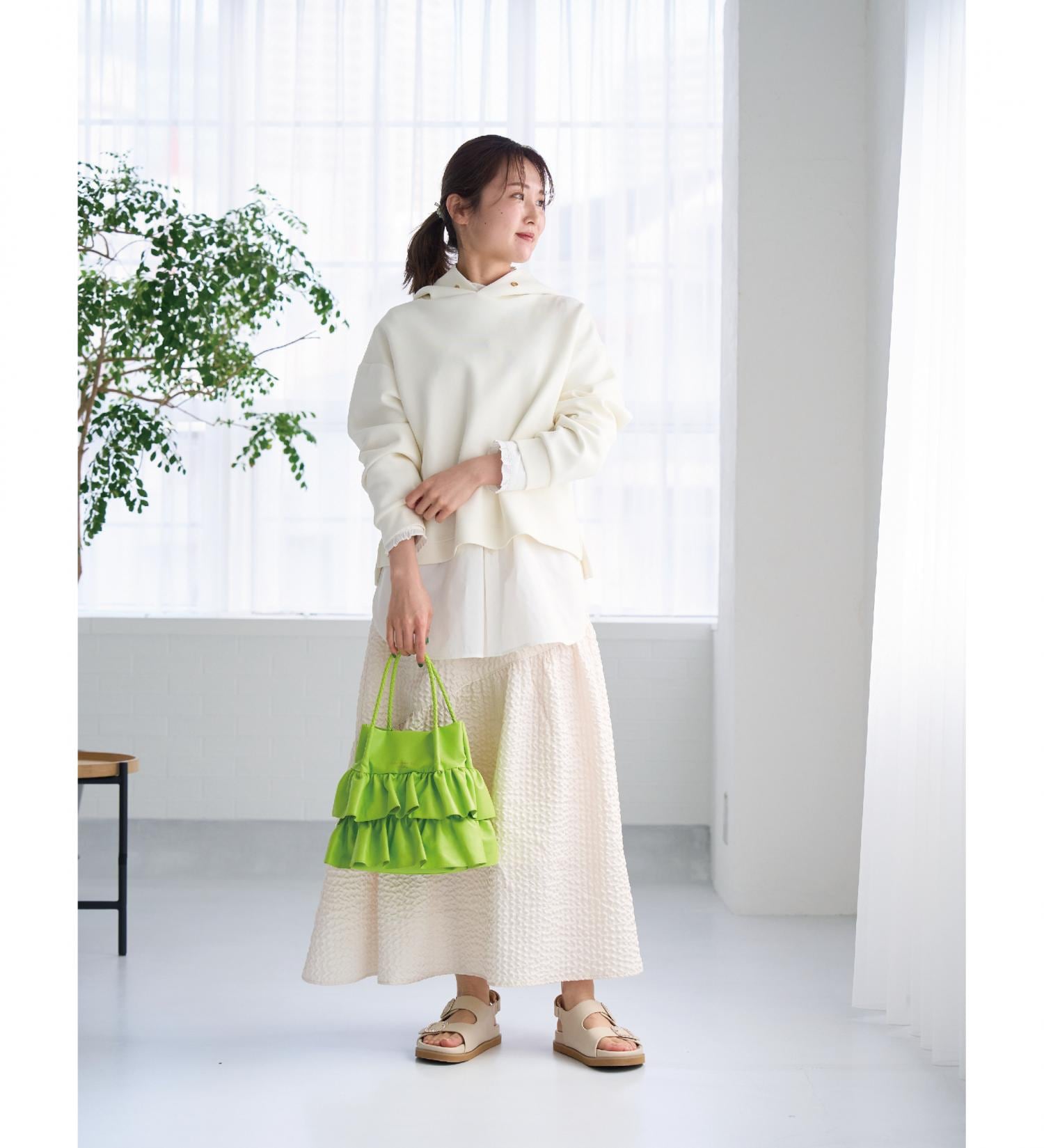 また、カジュアルなフーディーの首や袖からシャツのフリルを見せることで、程よい甘さを投入。ラフになりすぎず、でも甘すぎずという、ちょうど良いバランスを叶えた大人かわいい着こなしになりました。