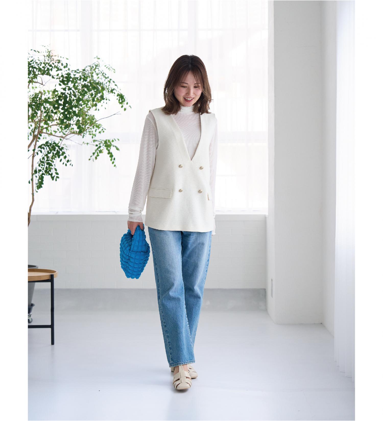 こちらの着こなしは、ジャケットをベストに変えたトレンドのベストレイヤードコーデ。一つアイテムを変えるだけで、かなり印象が変わりますよね。上半身をホワイトで統一することで、トレンドのベストレイヤードも抵抗無くチャレンジできます。