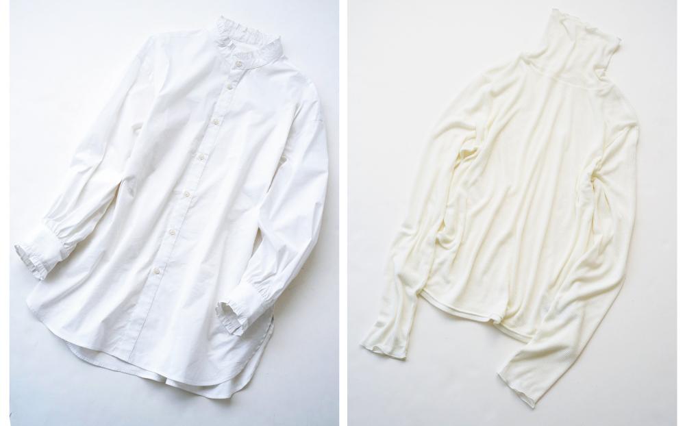(左から) フリルバンドカラーシャツ / シアーカットタートル