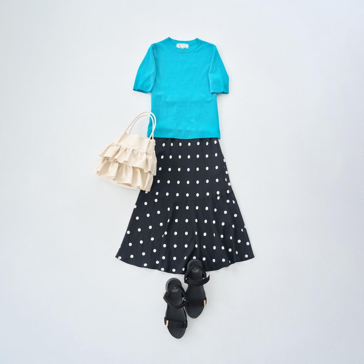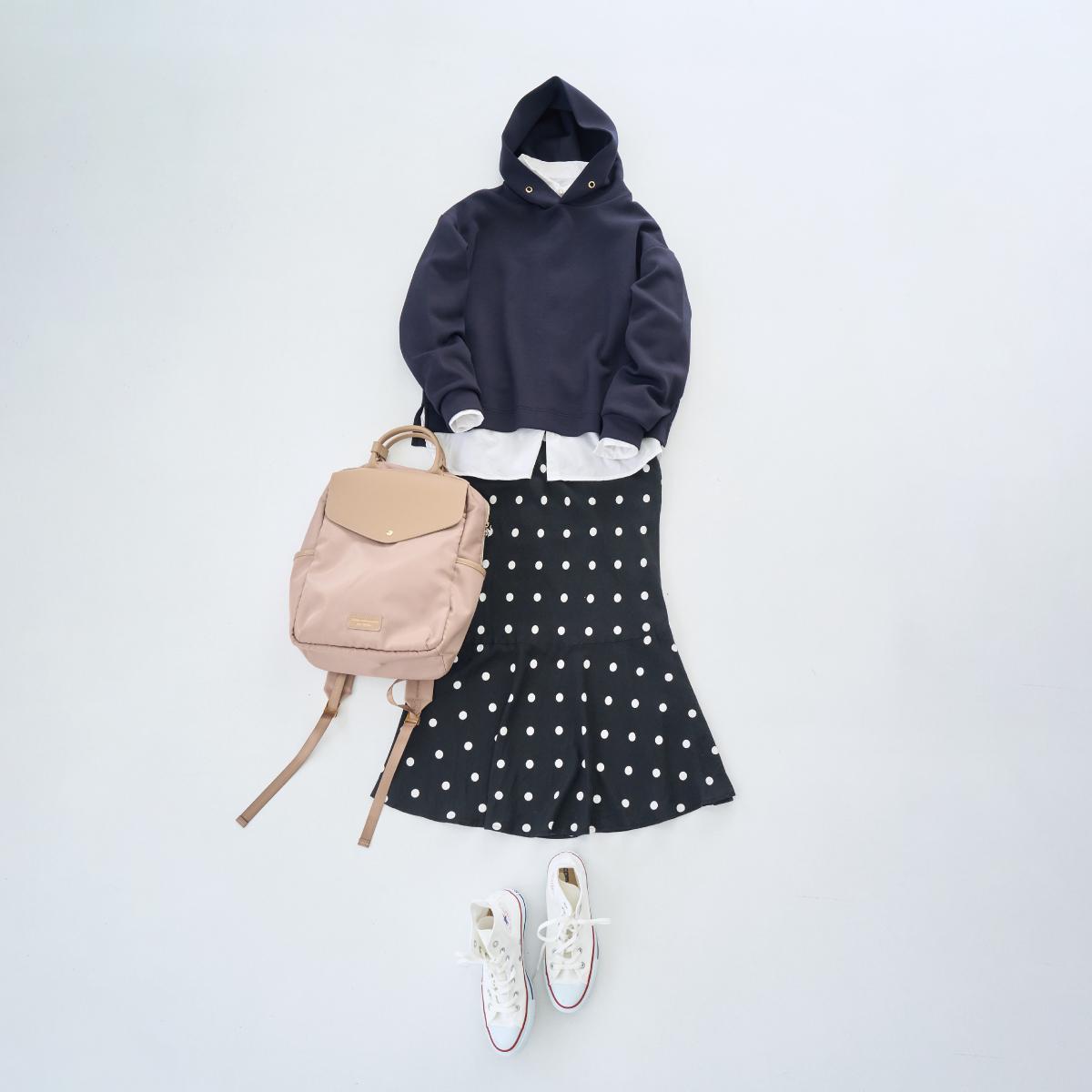 ナチュラルタイプがフェミニンな印象のドット柄スカートを選ぶ場合、得意なカジュアルアイテムを合わせると自分にフィットした着こなしになります。
