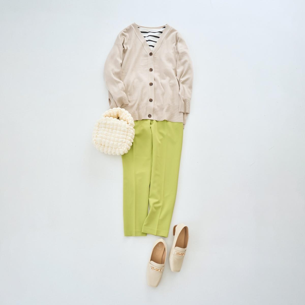 ボトムスには春らしいキミドリ色のスティックパンツでフレンチカジュアルな印象に。センタープレスでIライン効果もあり着痩せ効果も抜群です。
