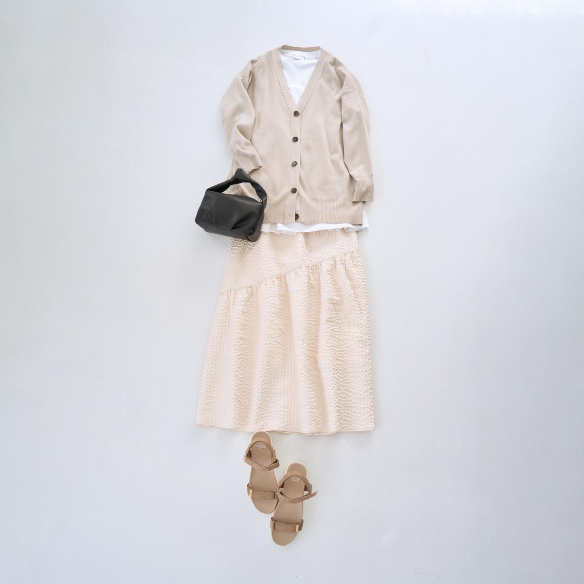 そこでボトムスには、得意な凹凸のあるジャガード素材のスカートを合わせることで今季らしくより似合う着こなしに。重心を下げるスタイリングでスタイルアップして見えるので、アシンメトリーな切り替えで目線を下に集めたり、また骨格の強さを和げて女性らしい印象にもなるのでオススメです。足元にはボリュームのあるサンダルを合わせることで、より重心を下げる着こなしにもなりますよ。