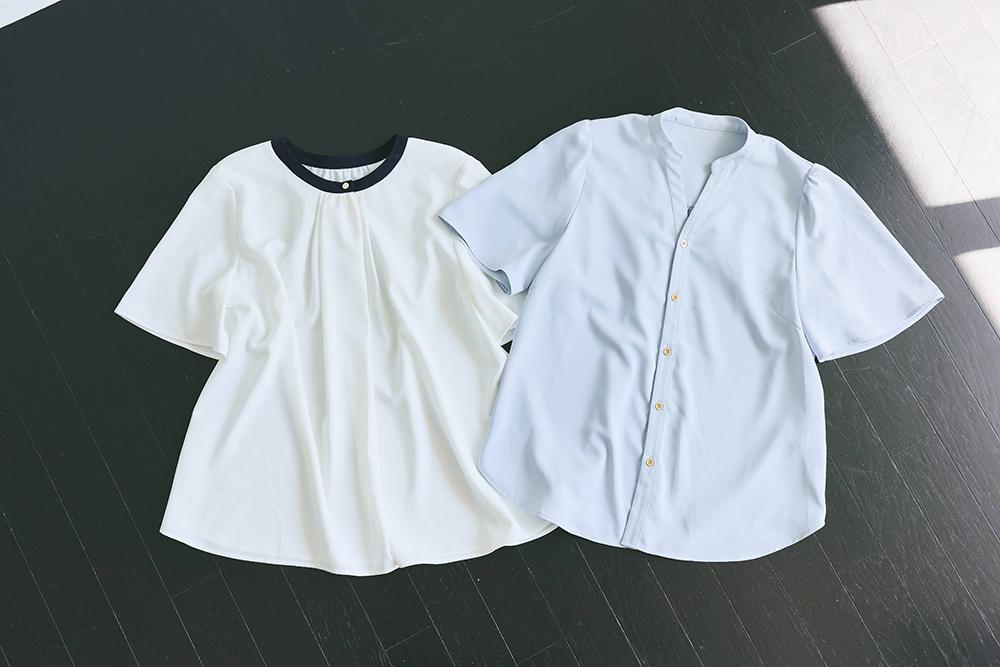 私が選んだデザインは、黒のパイピングが効いてアクセレスでもサマになる白ブラウスと優しい印象になるペールブルーの2着。5部袖は、スタイリストさんが今季こぞってコーディネートの候補に入れてくるほど、トレンドの袖丈。二の腕も隠れますし、今っぽさを出すのに間違いのない選びだと思います。