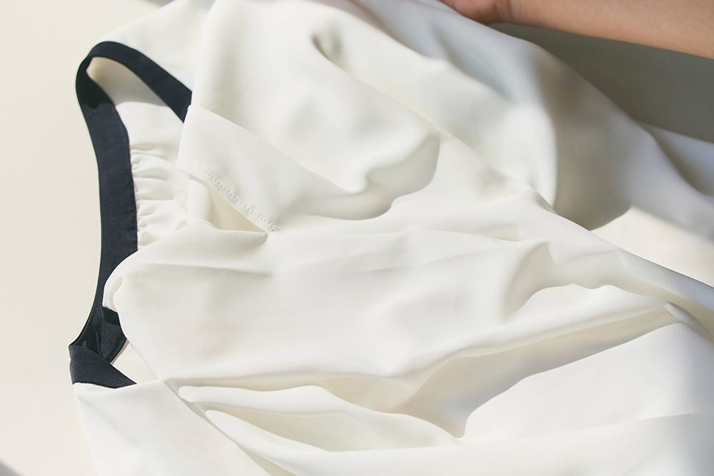 手をぱっと離してみると、嘘みたいにシワが寄ってない! 実は、3回ほどぎゅっと握って写真の通り。襟元も握ってみたり、あちこちにシワのプレッシャーを与えてみましたが何事もなかったように戻りました。これならどんなシーンも、きちんと感も保てそうです。