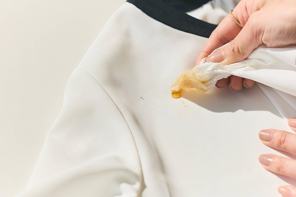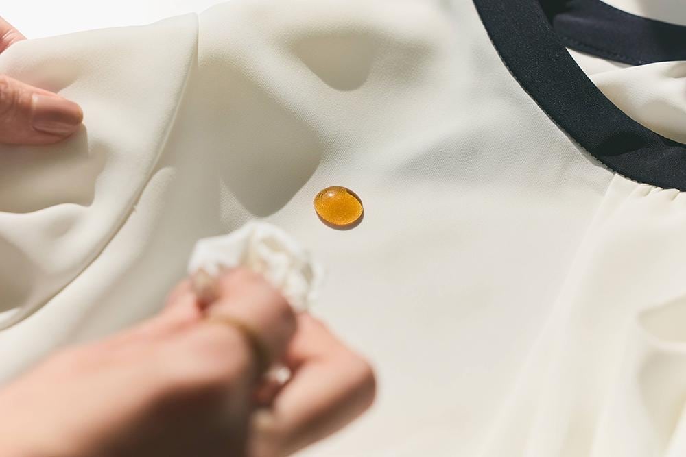 ティッシュをあてると、みるみるコーヒーを吸い込み、色残りはゼロ! 実はコーヒーをブラウスにこぼすのは危険すぎるから、水にしようかなどとカメラマンさんと話をしていたのですが、心配をよそに簡単に拭き取れました。