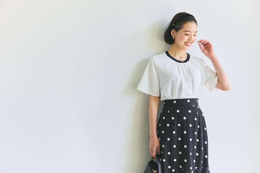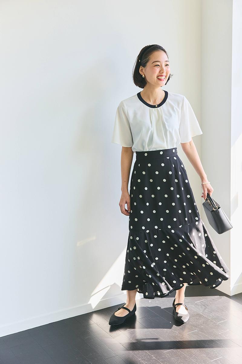トレンドのドットスカートと相性抜群。襟元の黒のパイピングが上半身を引き締めてくれるので、コーディネート全体がもたつかないで着こなせます。小物はコンサバティブなものを合わせて、キレイめにまとめました。