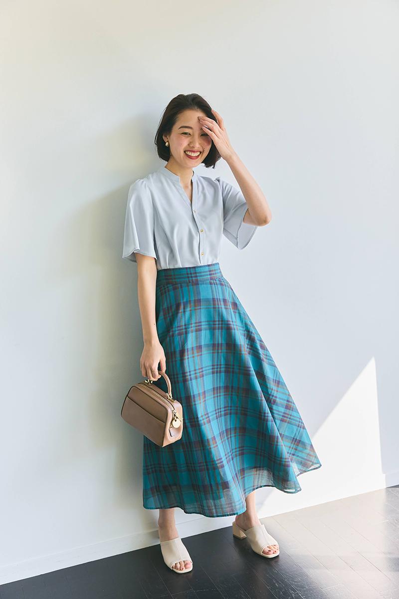 いつもモノトーン派でも挑戦しやすいペールブルーは、同じトーンのドラマチックなスカートと合わせれば都会的な印象に。小物はまろやかなベージュで統一して、優しげな雰囲気にすると好感度も足せます。