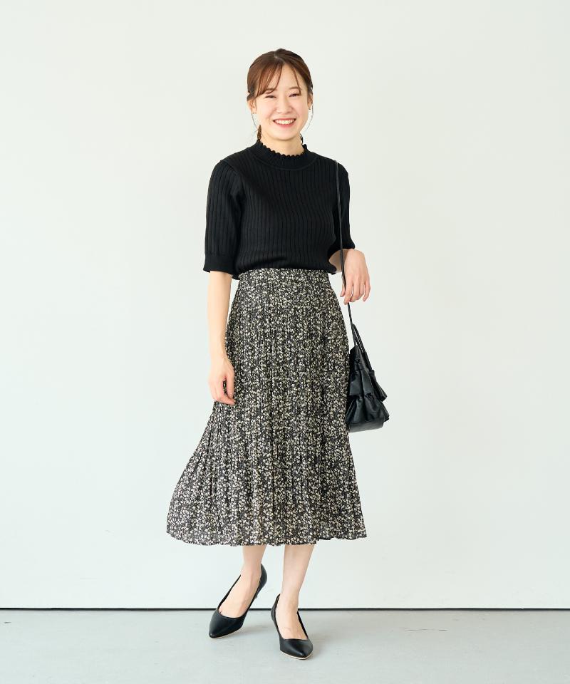 ガーリーな印象の小花柄スカートですが、モノトーンコーデでまとめると大人っぽい印象に仕上がります。ダークカラーを軸にすることで、フリルなども気負わず取り入れられますし、レディで秋らしい大人かわいいスタイリングになりますよ。