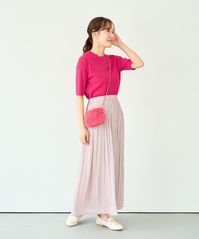 合わせたボトムスのエアリープリーツスカートは長めの着丈を選んで、コーデ全体の肌見せを減らしてあげると、一気に秋らしいムードになります。