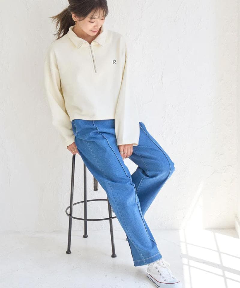 そんなストレートタイプにおすすめなのは、今季トレンドのハーフジップタイプのスウェット。