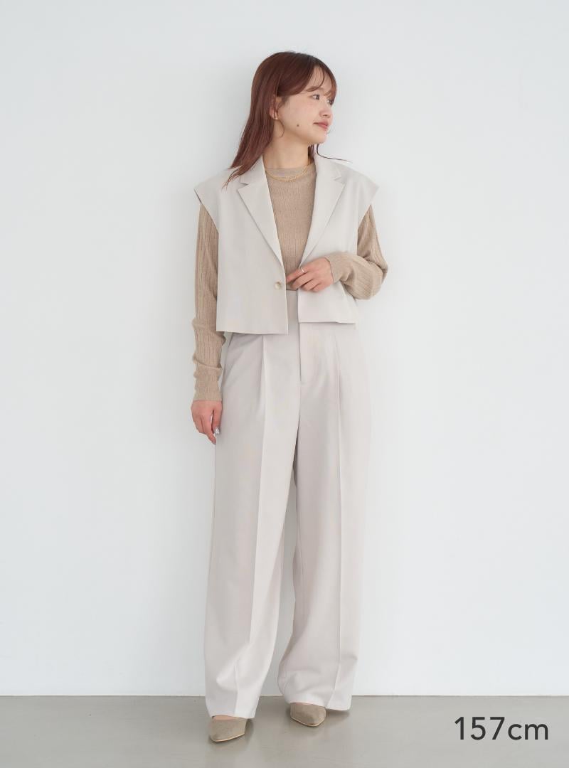 メンズライクなゆったりシルエットのジャケットに、ワイドパンツの組合せは王道コーデですが、重心アップとメリハリが大事なウェーブタイプにはもったいない。