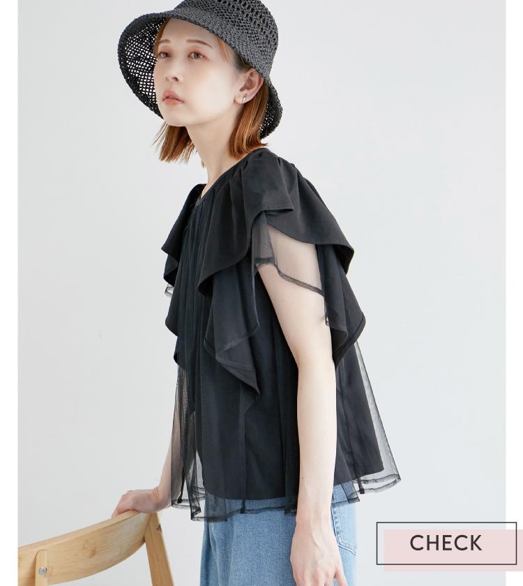 シアーなチュール素材を重ねた、フリルスリーブのカットトップス。