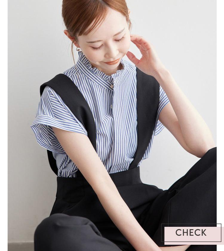 襟元にフリルを飾ったフェミニンなバンドカラーシャツは、合わせるボトムスによってオフィスでも着られる万能アイテム。