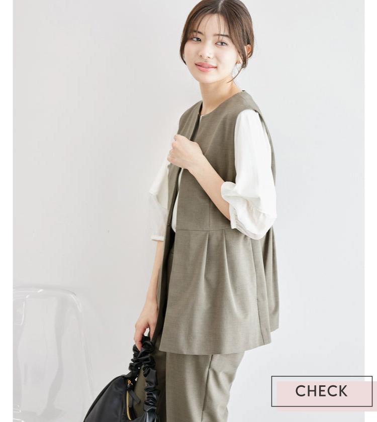 ヒップに掛かるほどの着丈なので、前のフックを開けてデニム合わせのカジュアルスタイルも◎。ジャケットやパンツとセットアップでお仕事にもおすすめです。