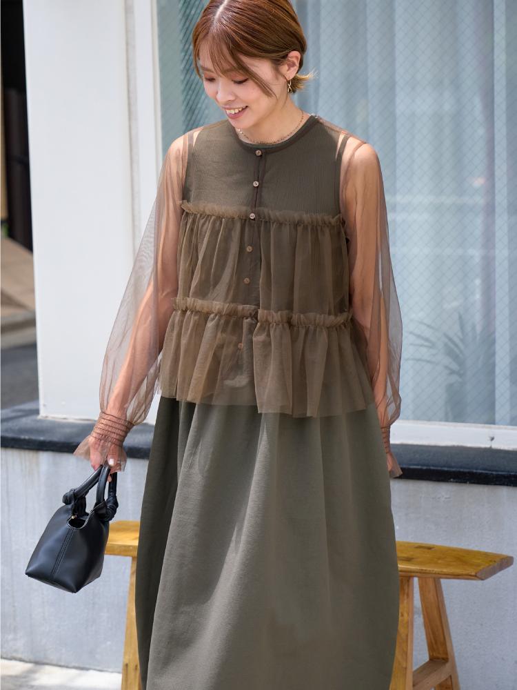チュール×フリルの甘素材のトップスは、ビターなブラウンを選んでフェミニンに着地。