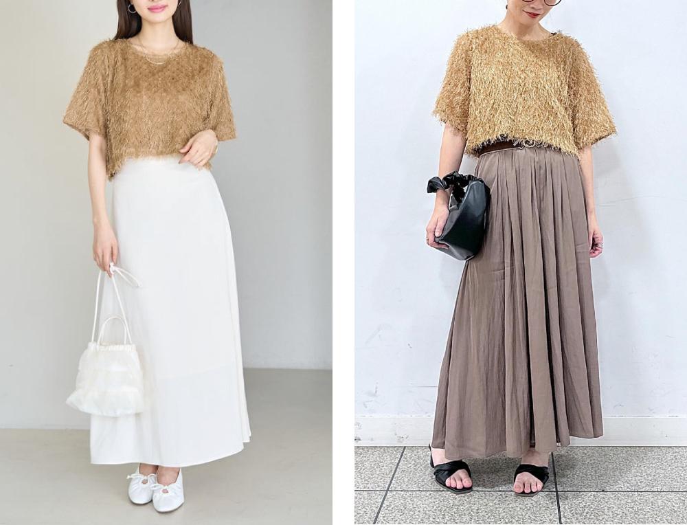 毛足のあるフリンジ素材は透かし編みで夏らしい涼やかさをプラス。