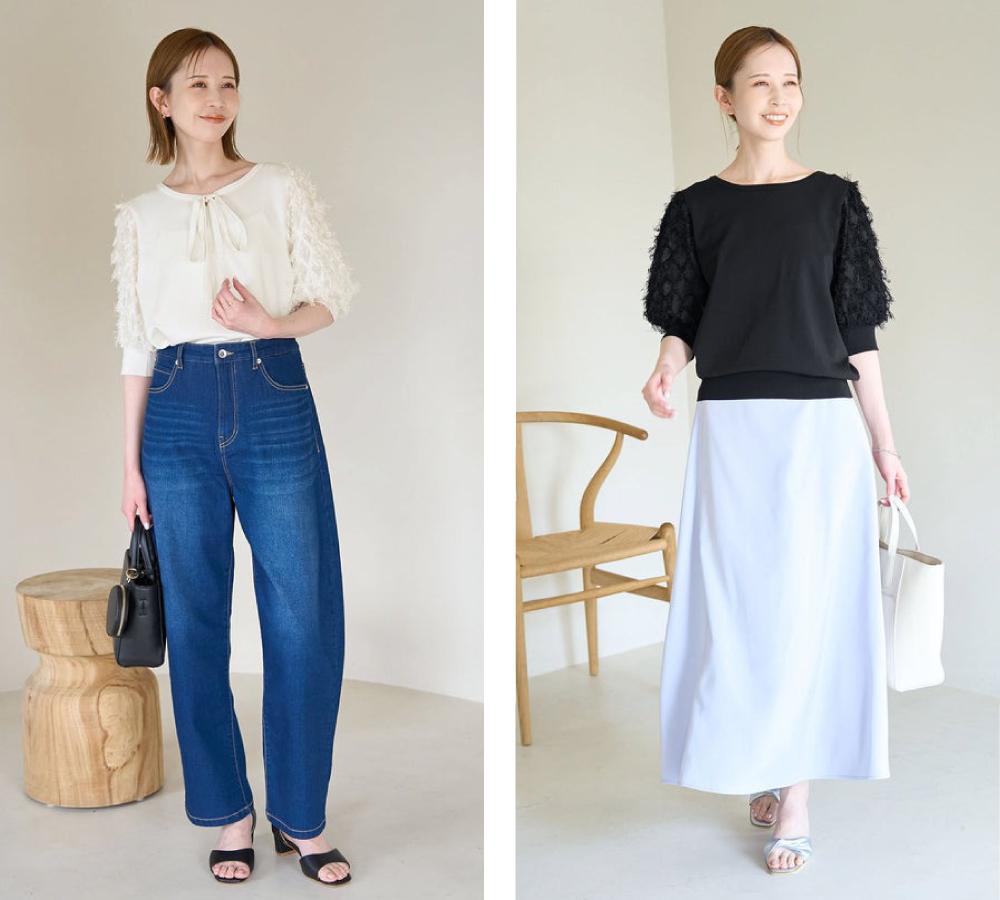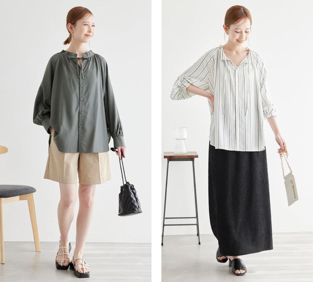 ヒップに掛かるほどの着丈で体型カバーも叶えるブラウスは、合わせるボトムスによって季節感を調整できます。