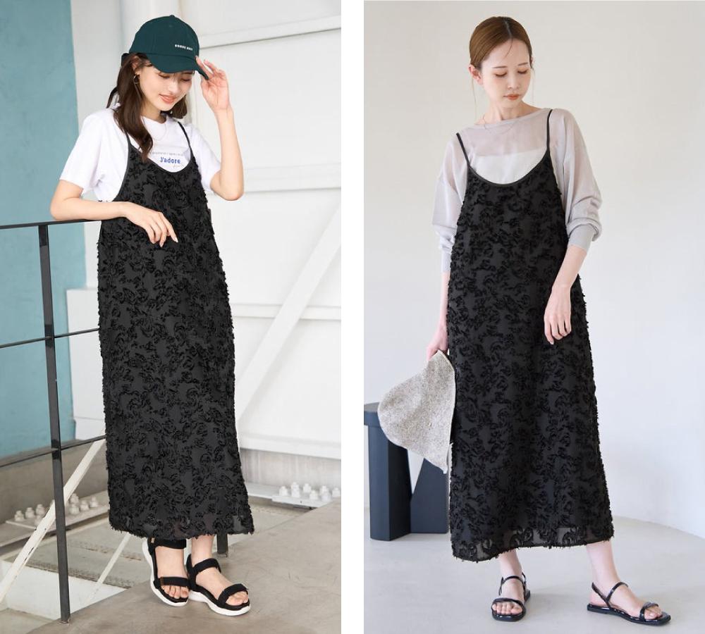 大人も着やすい表情感のあるジャガード素材のキャミワンピースは、インナー次第でオールシーズン着用できるので、ワードローブにあると安心な1枚です。