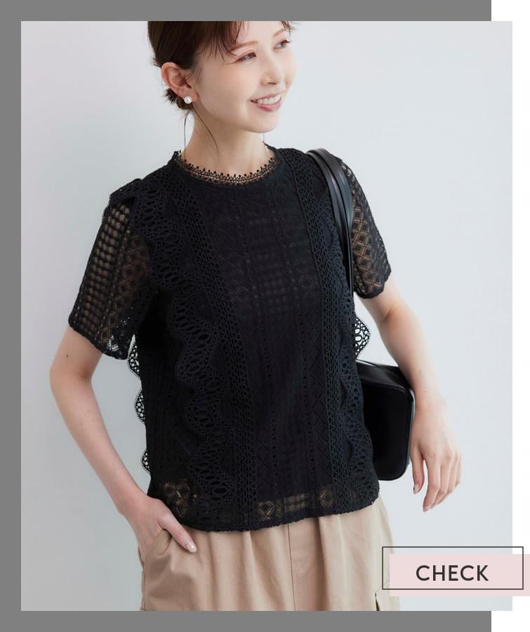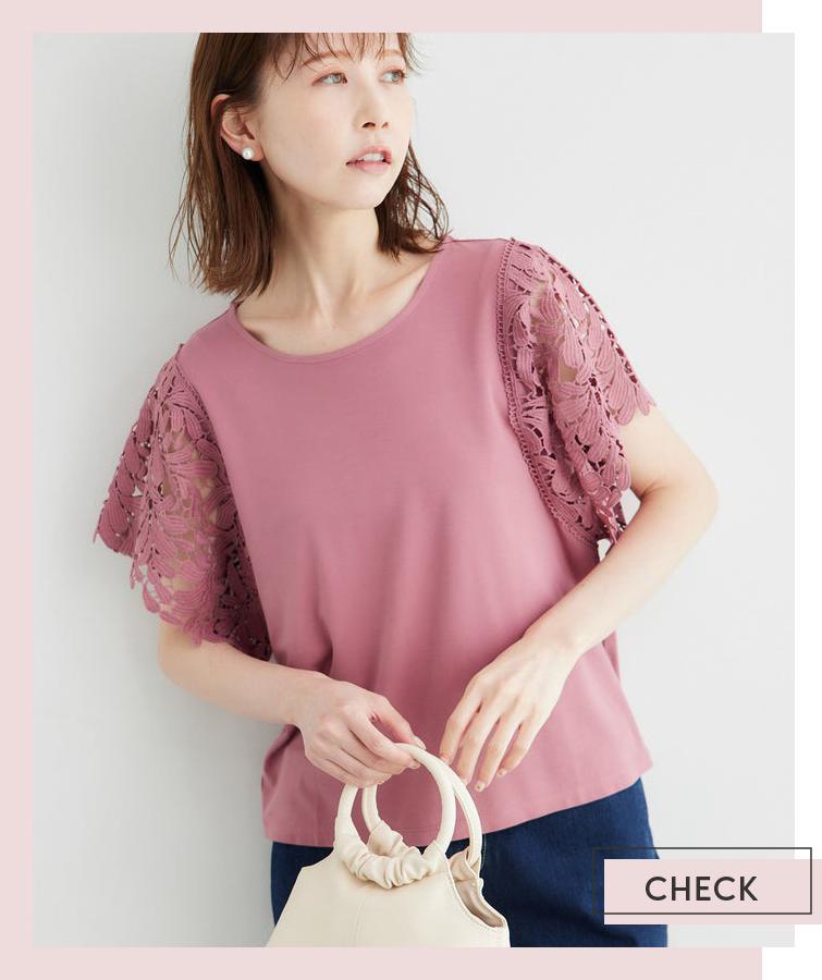 大きめの袖と大柄のレースが、ナチュラルタイプにとって気になる肩まわりのフレーム感をさりげなくカモフラージュしてくれます。
