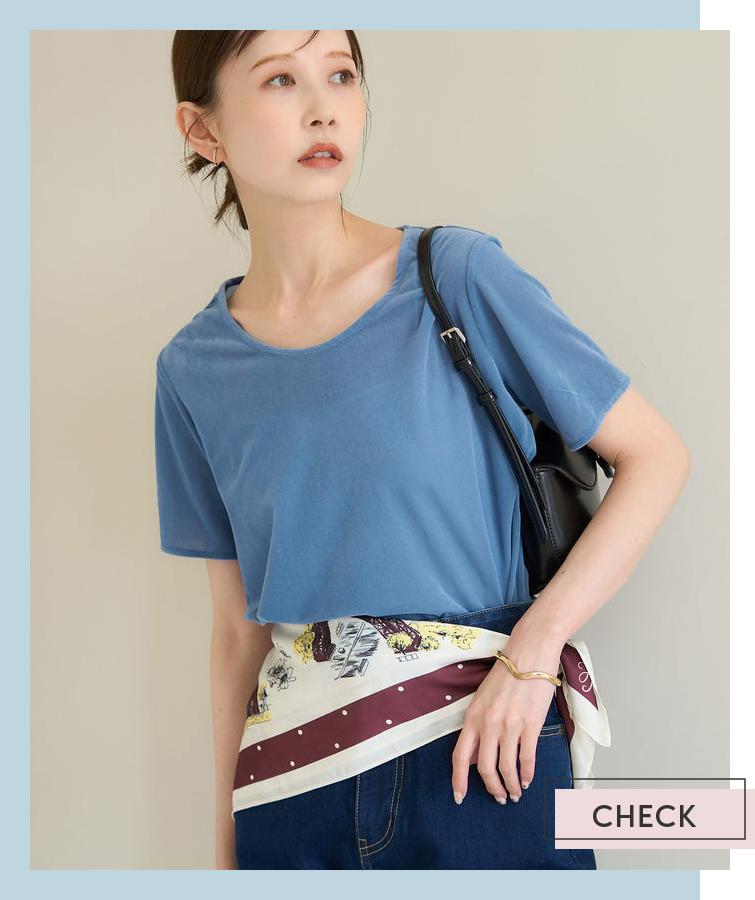 秋の気配を感じさせてくれるベロア素材。シアー感のある半袖トップスなので、今の季節にピッタリ。