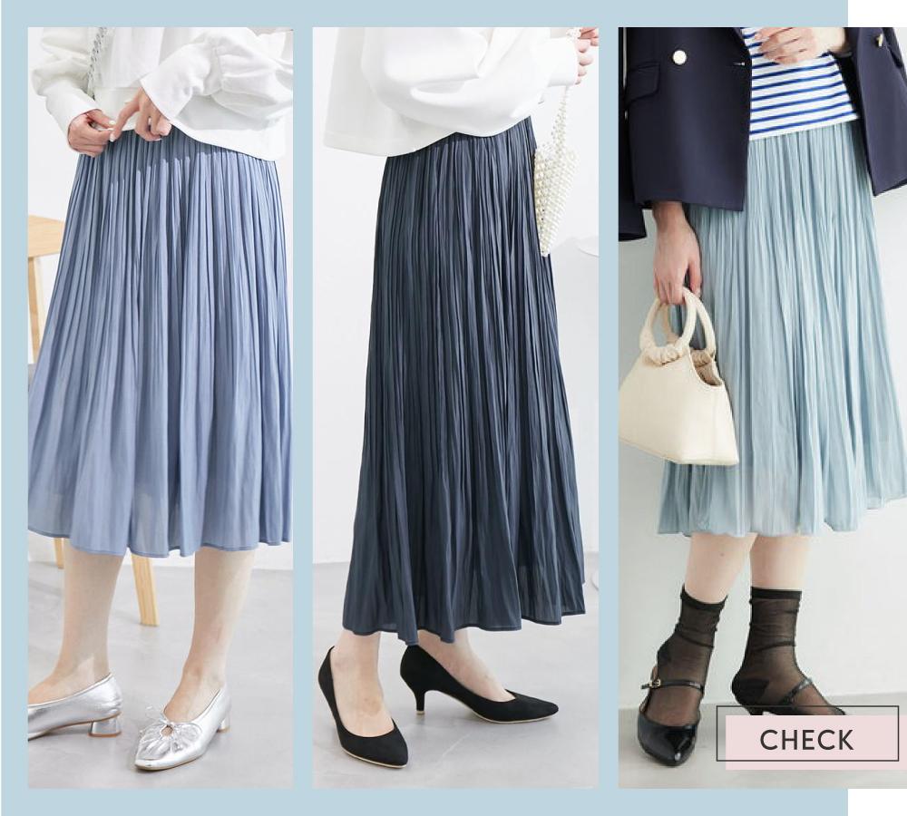 ふわっと揺れるプリーツスカートが得意なウェーブタイプは、重心が下がって見えないように、着丈は足首がしっかり見える丈がベスト。