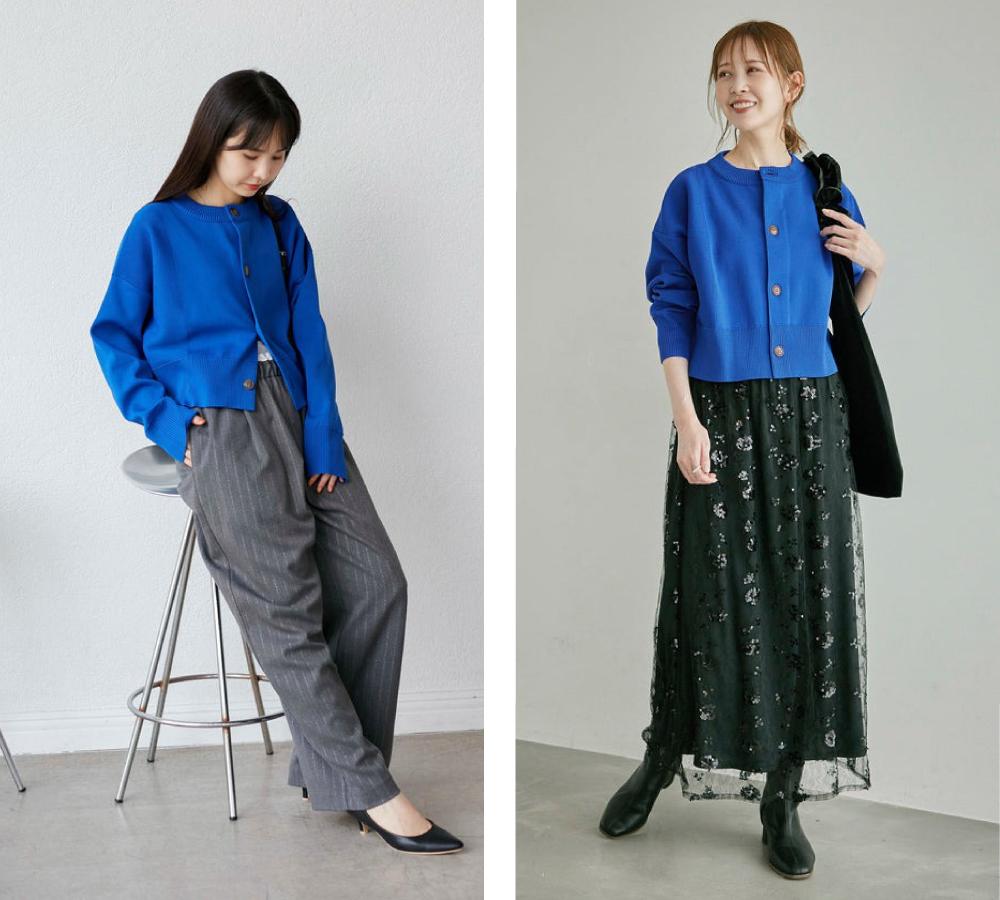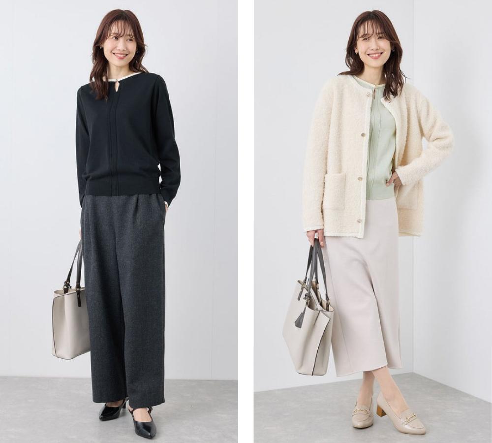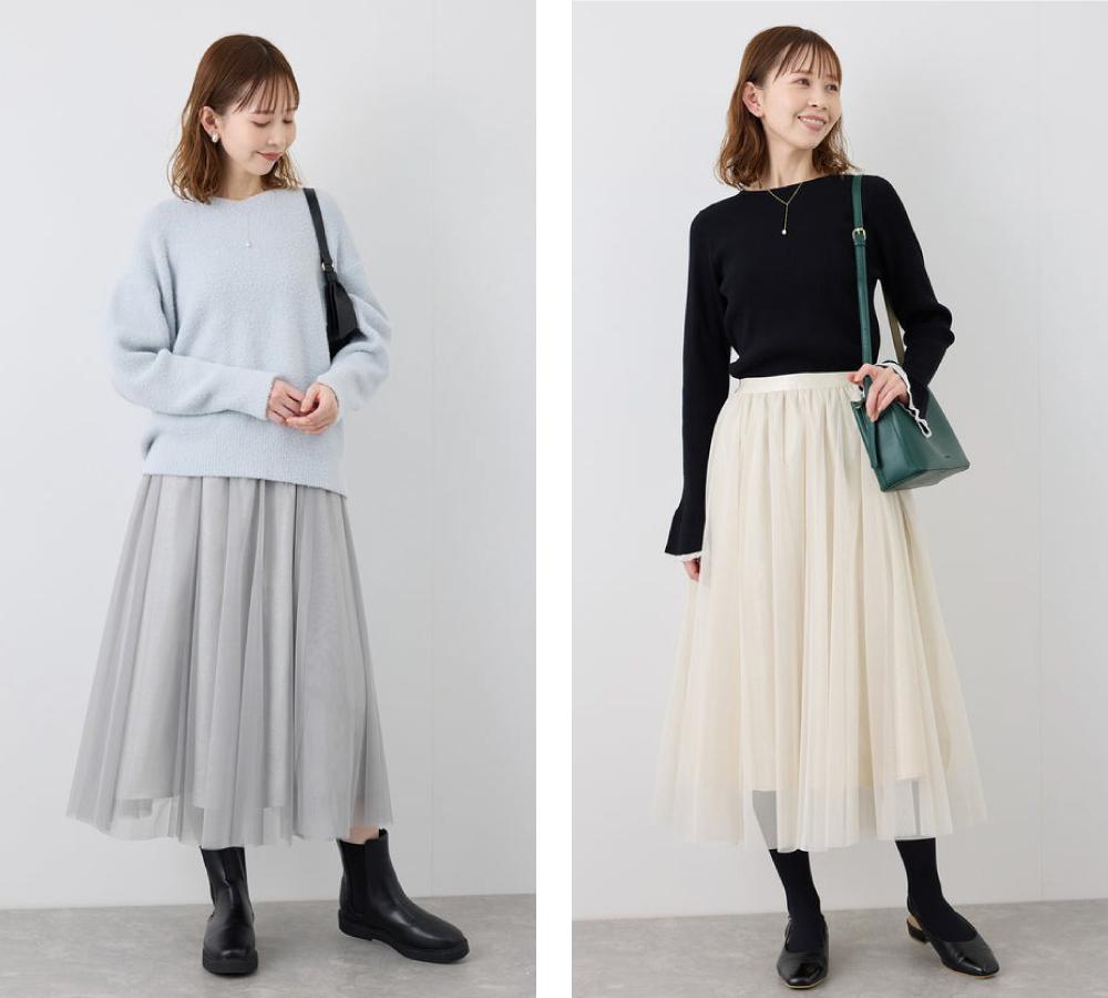 冬はニットで素材感の違いを楽しんで、春はブラウスに合わせてきちんとスタイルも◎。