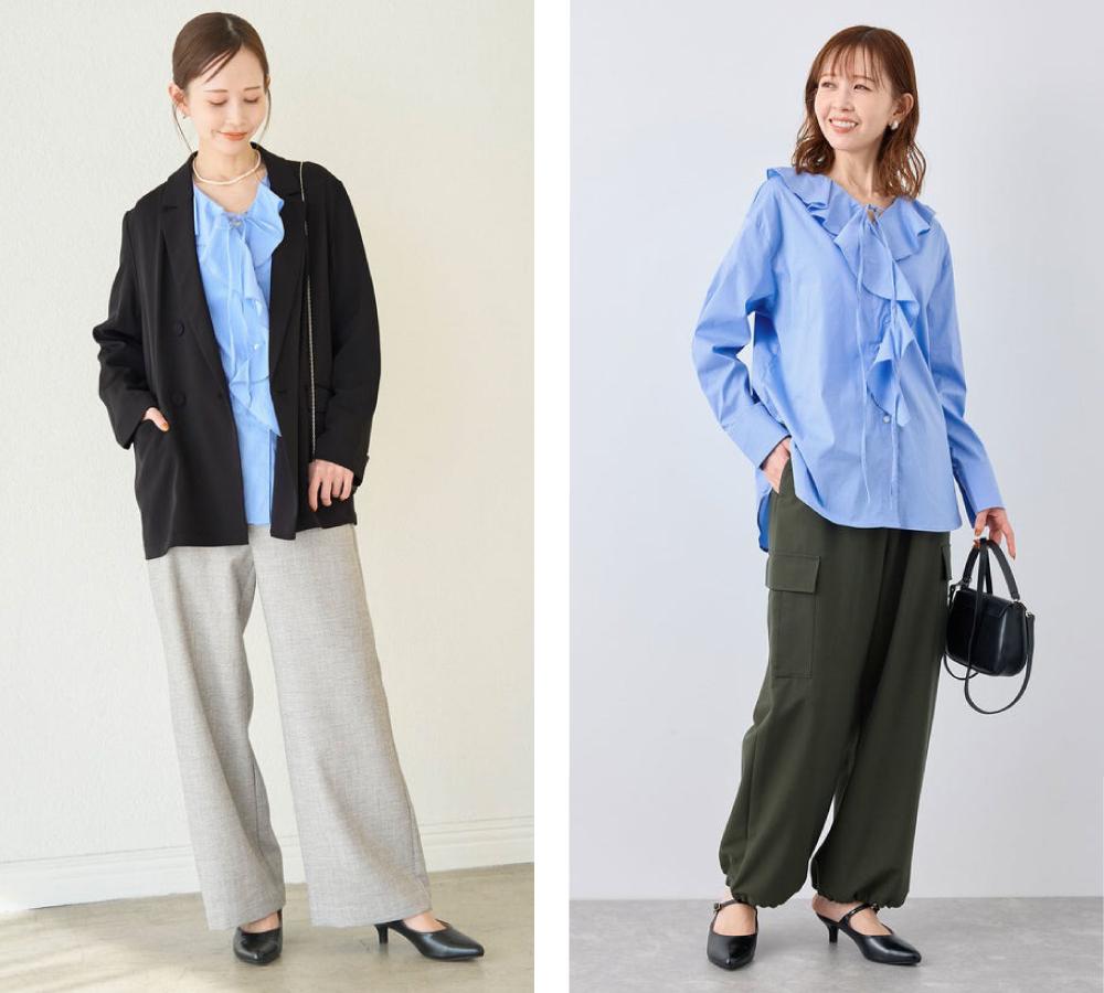 少しハリのある素材なので寒い日にはインナーにタートルをあわせて、春には1枚はもちろん、ジャケットのインナーで着用すると、揺れるラッフルが顔まわりを華やかに魅せます。