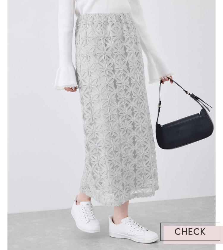 フラワー柄のチュールレースを用いたタイトスカート。 クリアな素材感と色合いは甘すぎない印象を与えてくれるので、合わせるトップス次第でON/OFF着回せます。