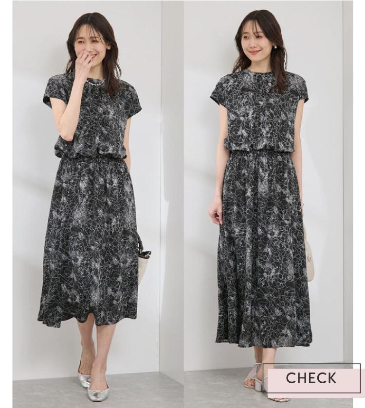 線で描いたような独特な総柄と花柄がポイントのプリントワンピース。