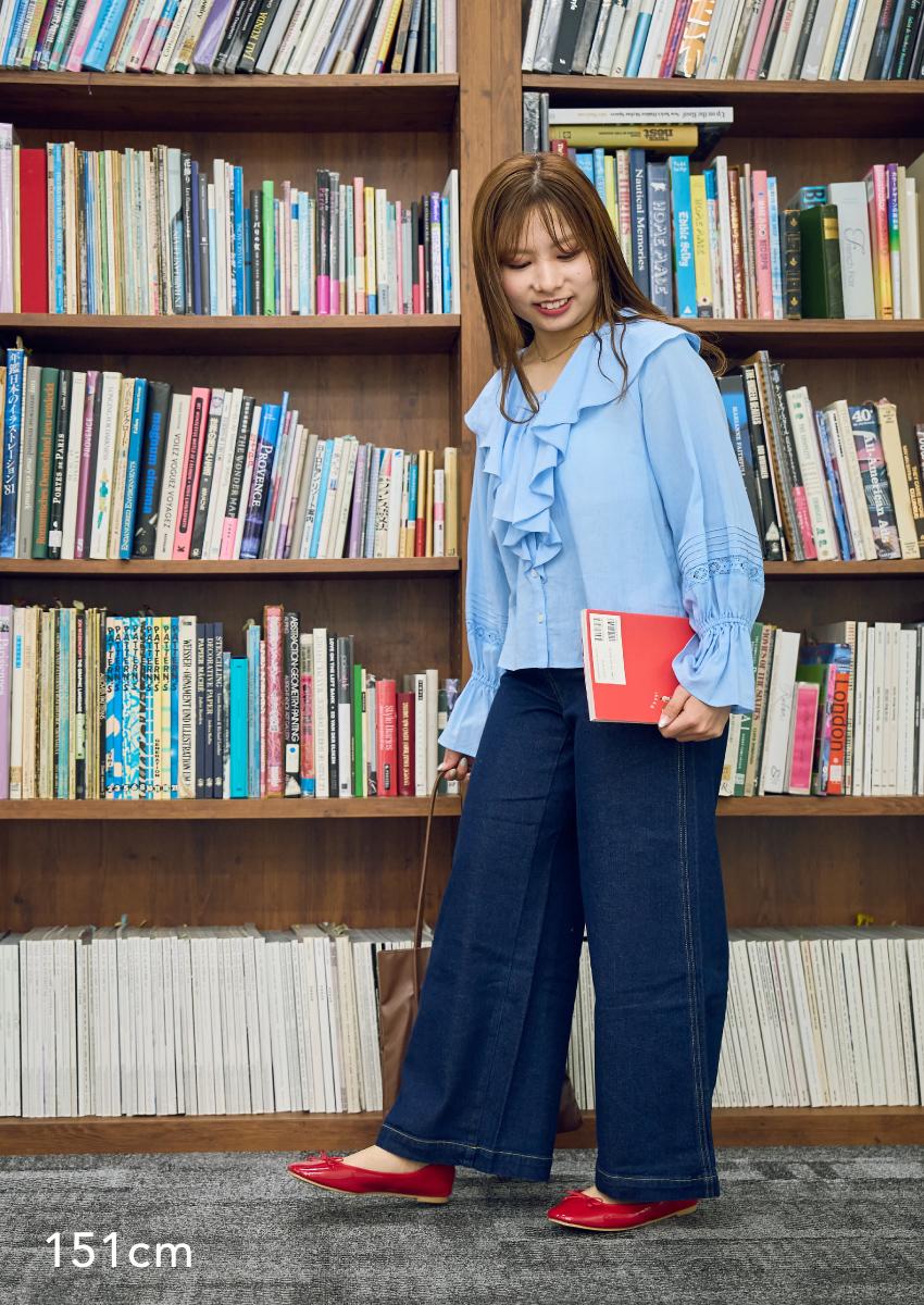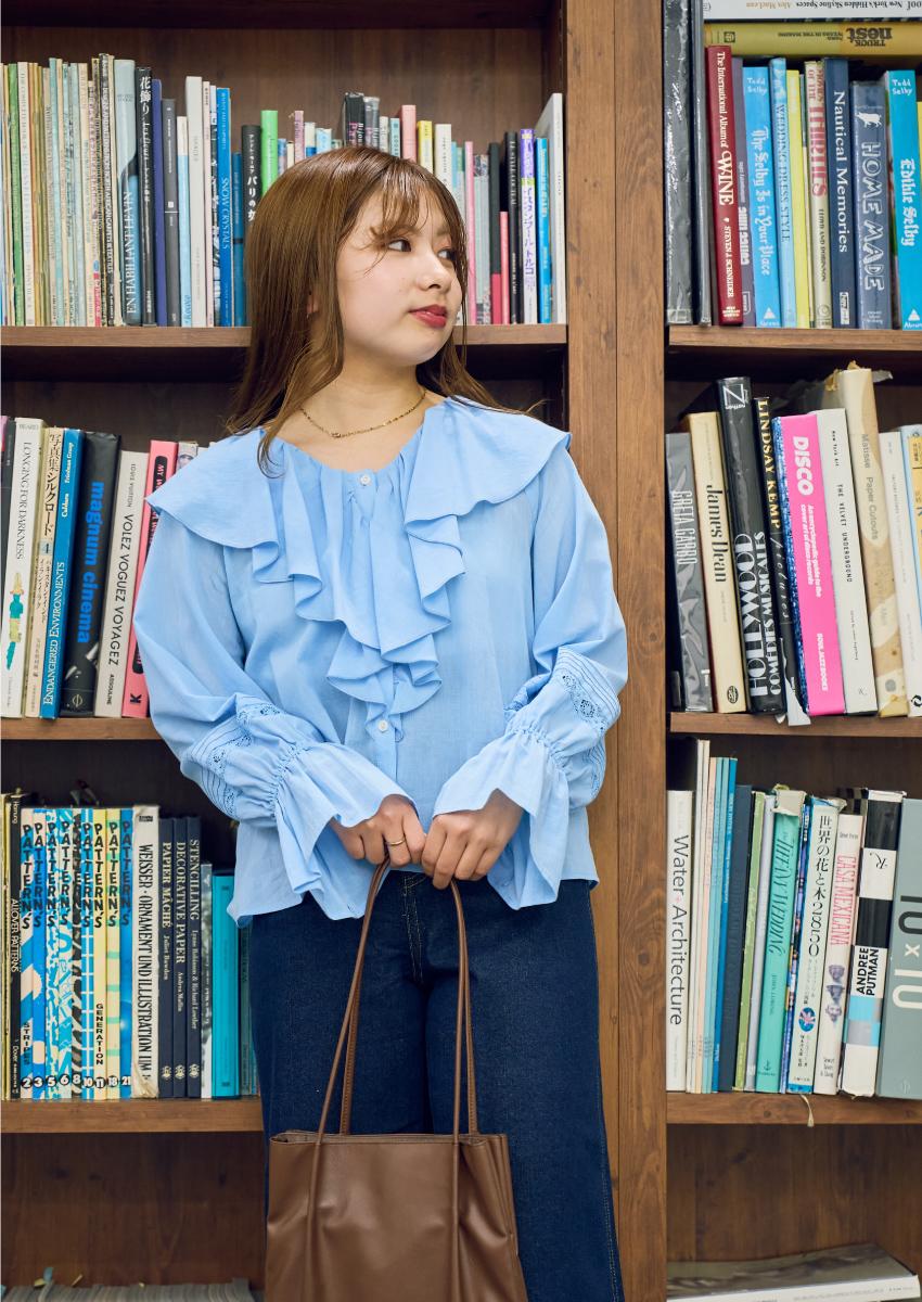 白Tや白ブラウスなどベーシックな色を合わせがちだけど、20代のハツラツとした魅力をより引き立てる“デコラティブなブルーブラウス”を投入してみて。