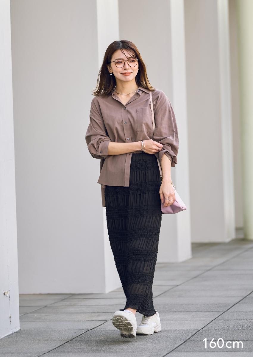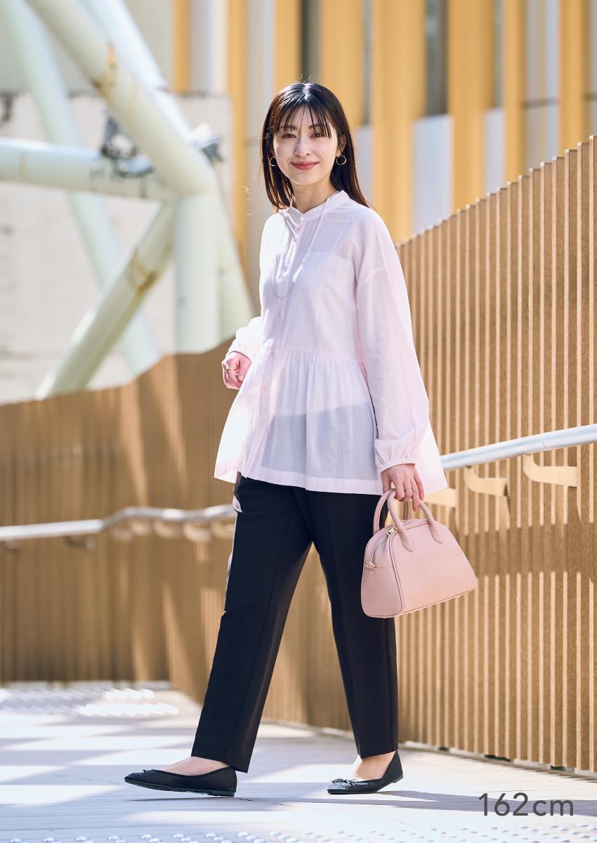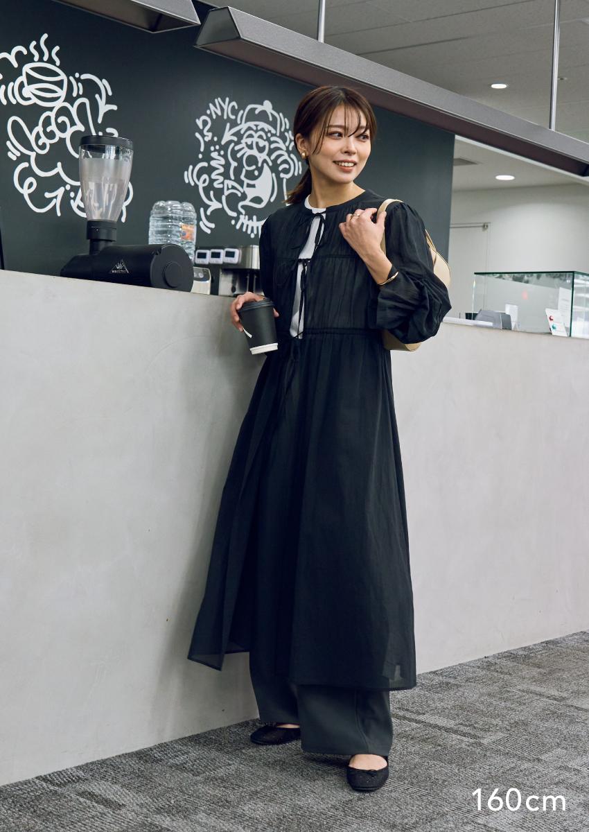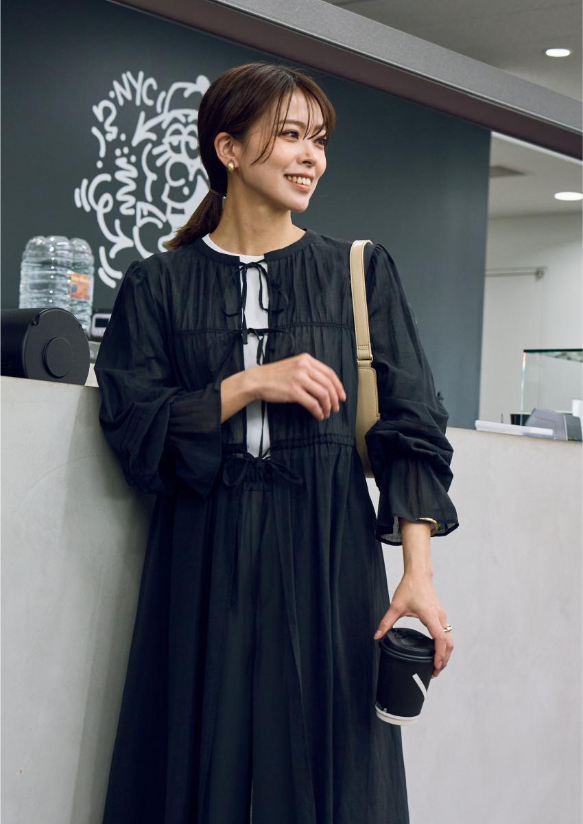 体型をフラットに見せてくれるガウンワンピースをブラウスとして着るのがおすすめです。透け感のあるブラックは顔まわりを暗くせず、ギャザーと小リボンでむしろ程よく華やかに傾けてくれます。