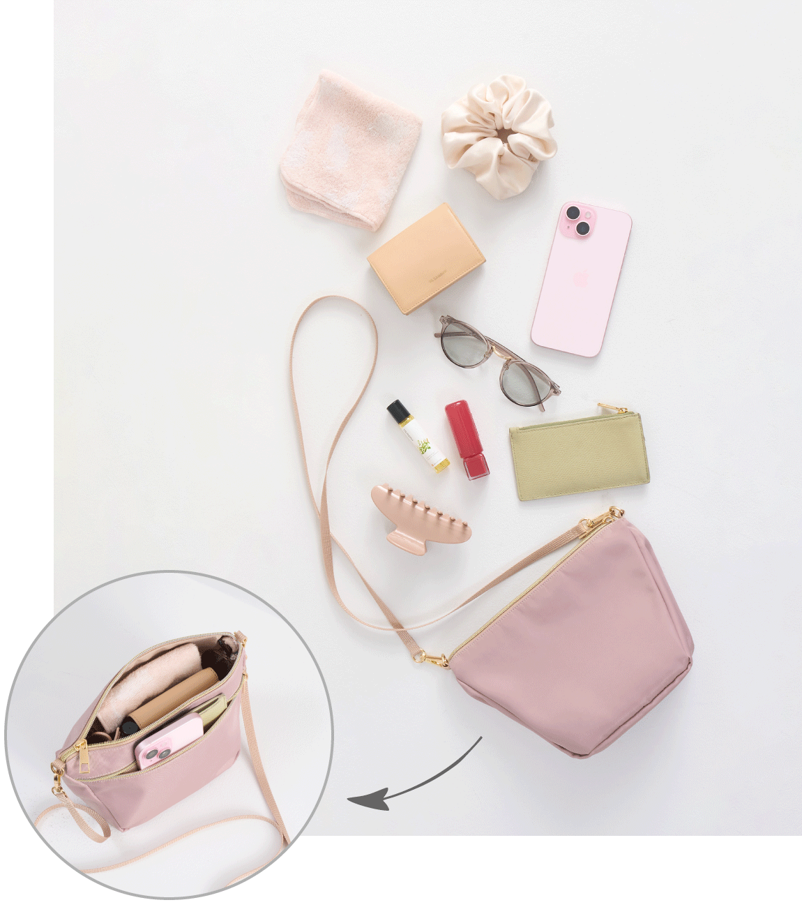 お財布、リップ、ハンカチ、パスケースの必要最低限の荷物はマストで入る容量を基準に、ヘアアクセサリーやサングラスなど季節で持ち歩きたくなるアイテムが、“およそプラス2個”入れられる余裕を持たせました。