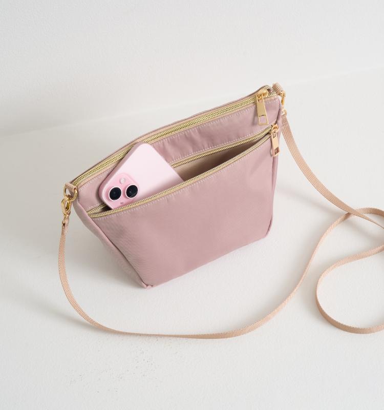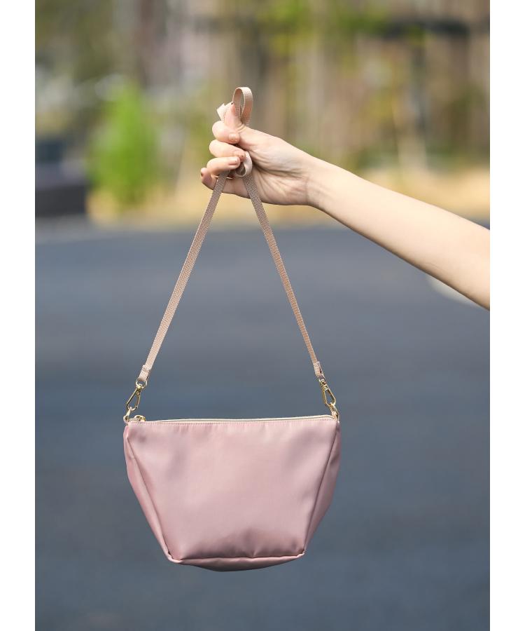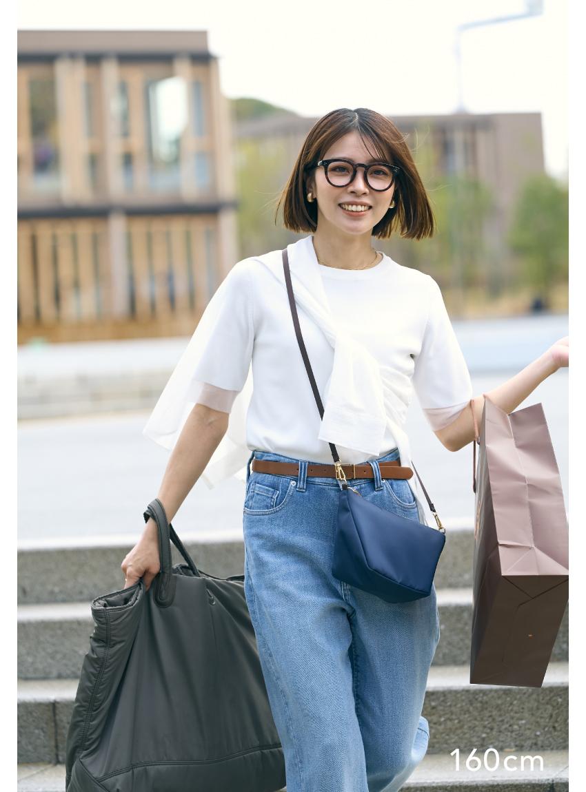 驚きの“高見え”を実現したのが、上質さを感じる滑らかなポリエステル生地とゴールド金具のシックな輝き。またショルダー紐を細く仕上げることで、カジュアルすぎない“きれいめ”な印象に仕上げました。