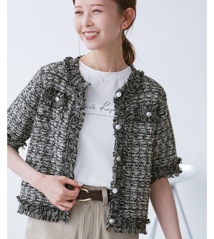 幅広いコーディネイトが楽しめるツイードジャケット風のカーディガン。