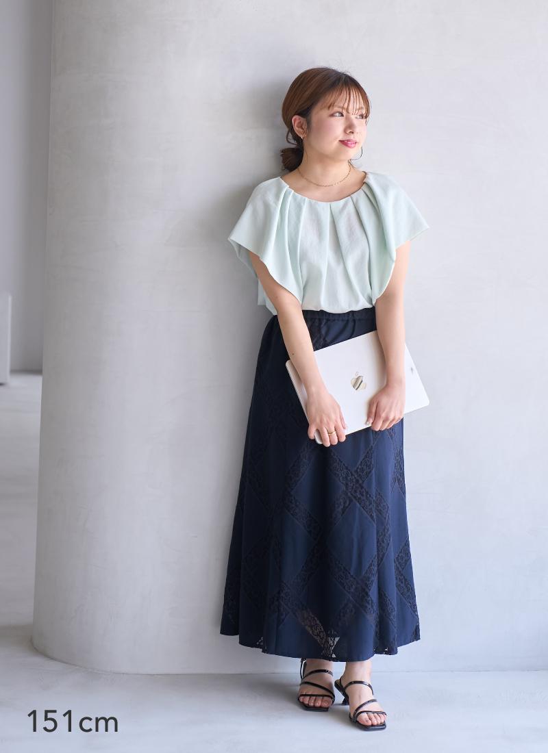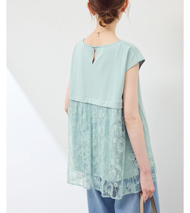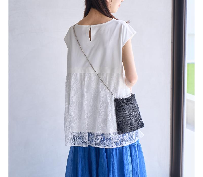 前身頃はシンプルなデザインですが、後ろにレースがドッキングされていて上品な華やぎのある一枚。