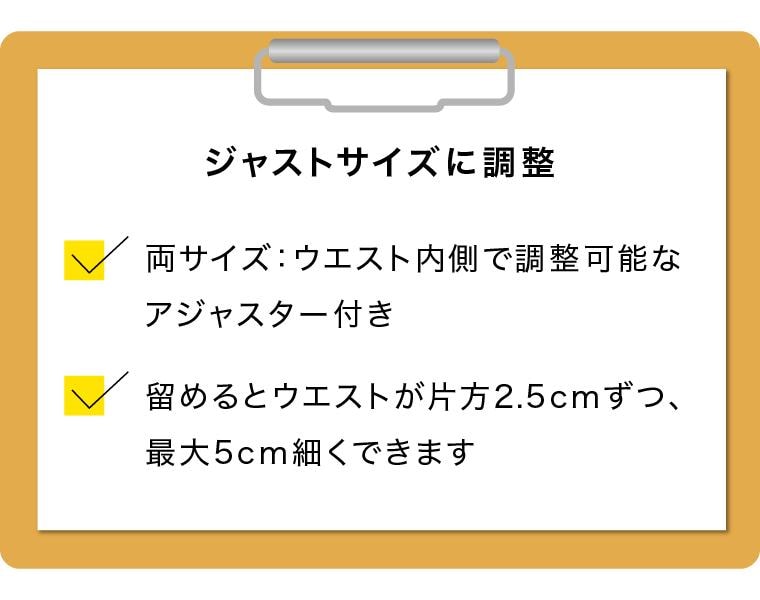 “丈が短くなるとウエストも小さいので諦めていた”という声にもお応えして、両脇ウエスト内側で調整可能なアジャスター付き。