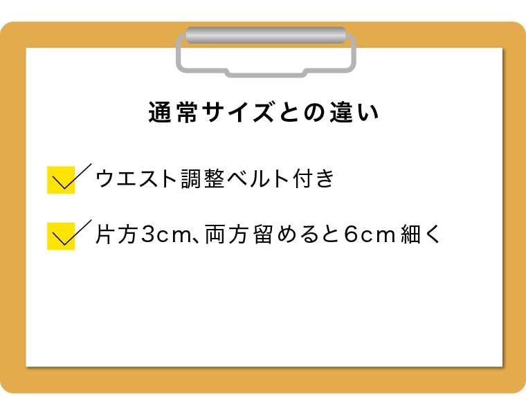 小柄さんサイズにはウエスト調整ベルトを採用!