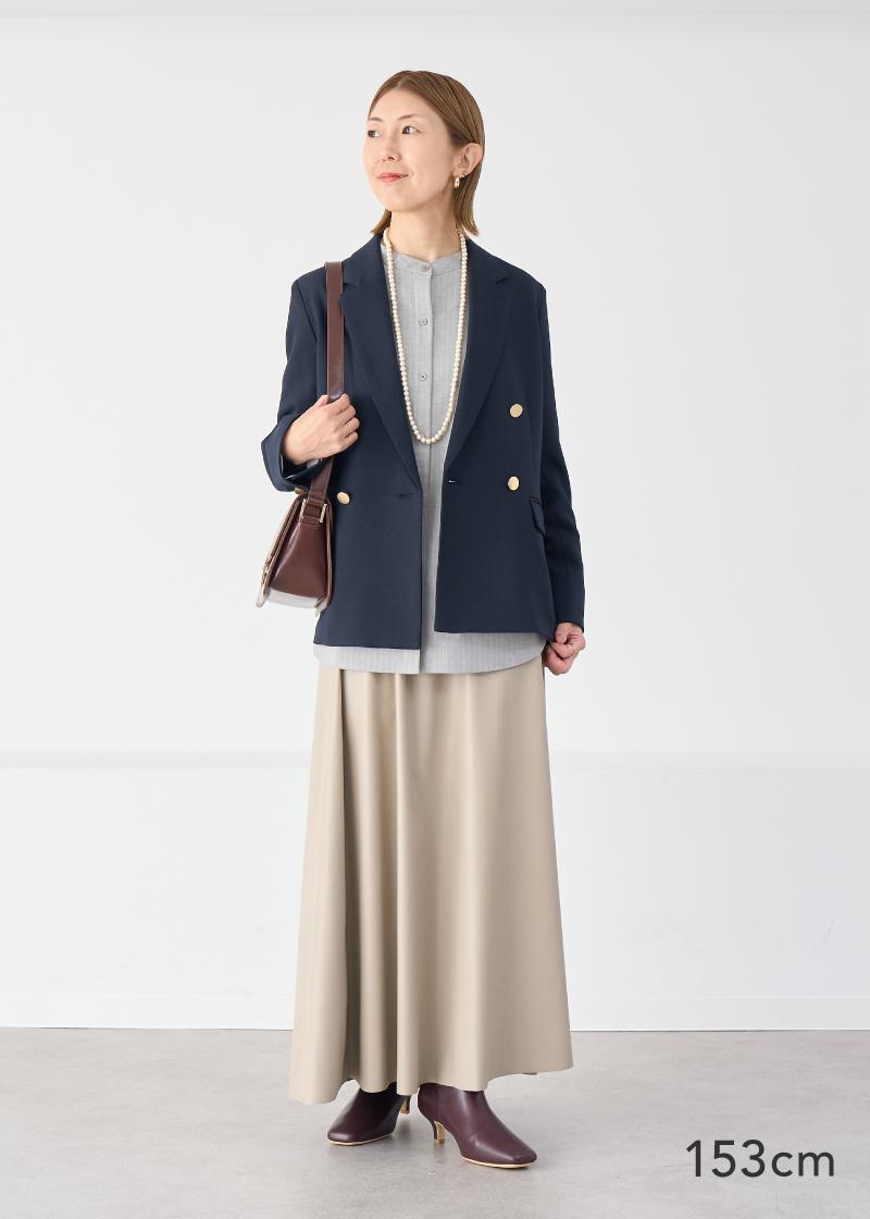 普段はジャケット+パンツが好きですが、今回は秋らしくベージュのフェイクレザースカートを選んで、インナーはグレーのノーカラーシャツで女性らしいハンサムスタイルにしました。