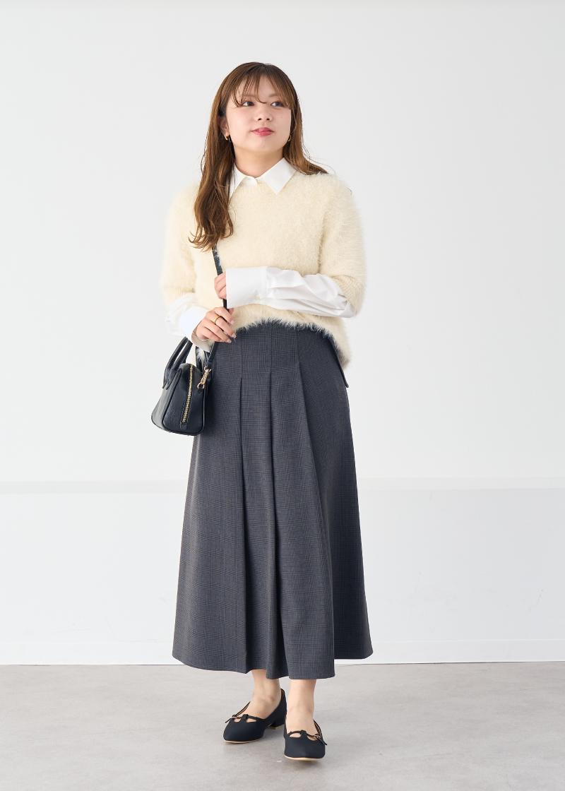 クラシカルな印象のスカートに、ふわふわのシャギーニットを合わせて少し甘めにスタイリングしました。