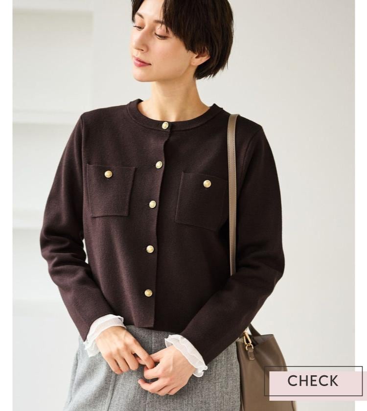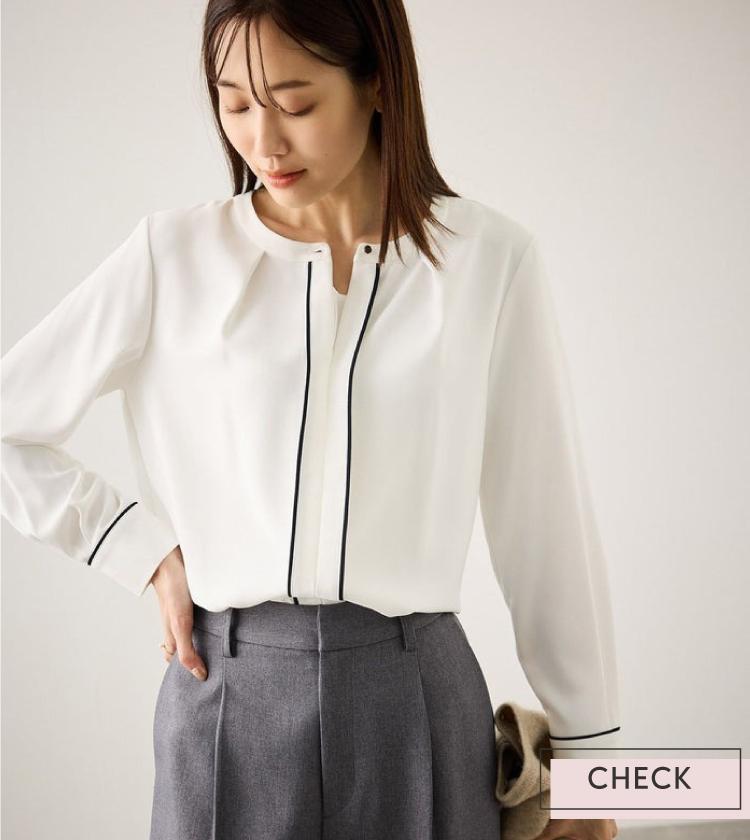 ジャケットのインナーとしてはもちろん、カーディガンと合わせても上品できちんと感のあるスタイリングに。