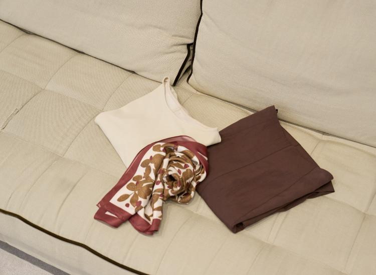 バッグにはブラウン系のスカーフを結んでさりげないアクセントにすれば、地味見えも回避できますよ。